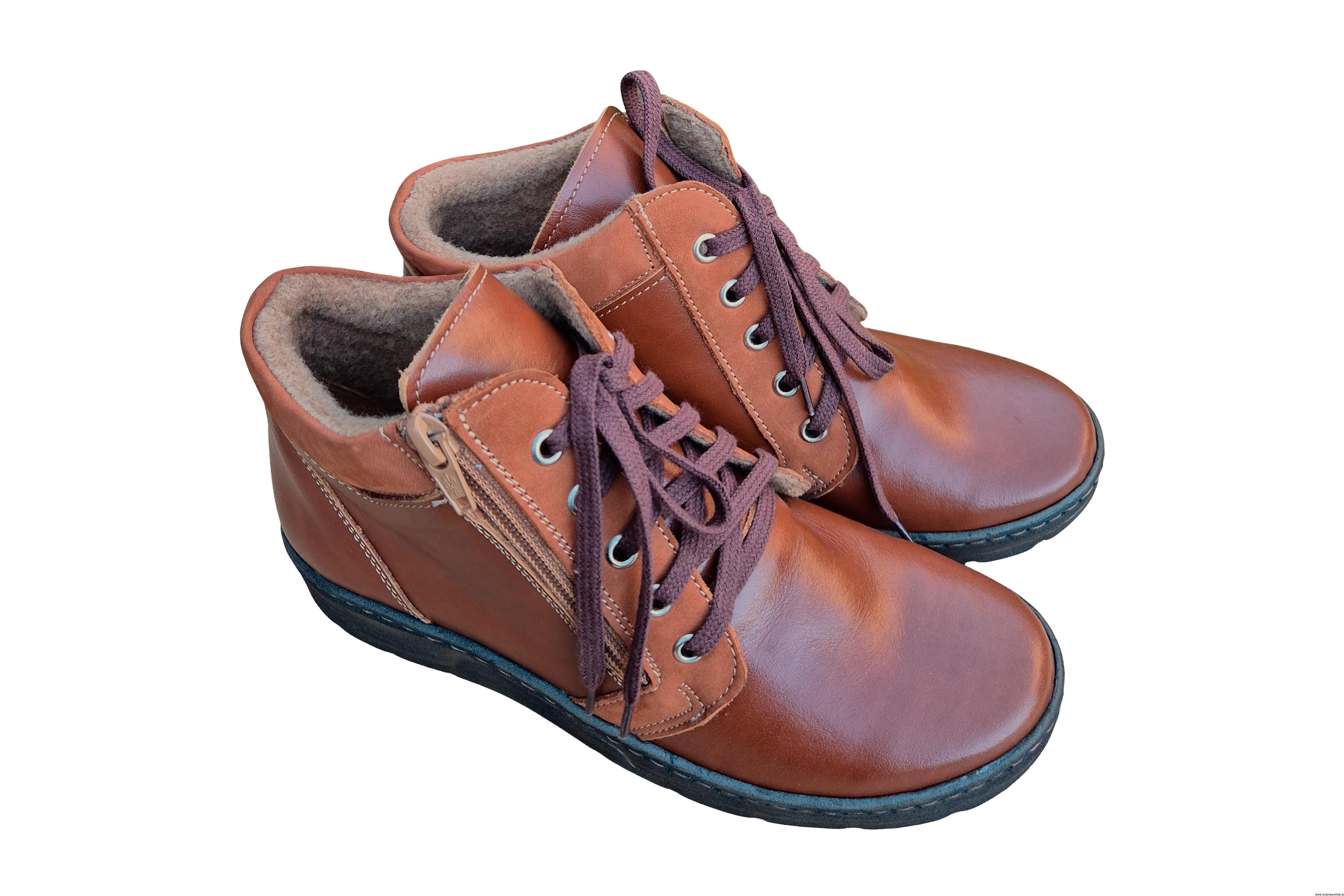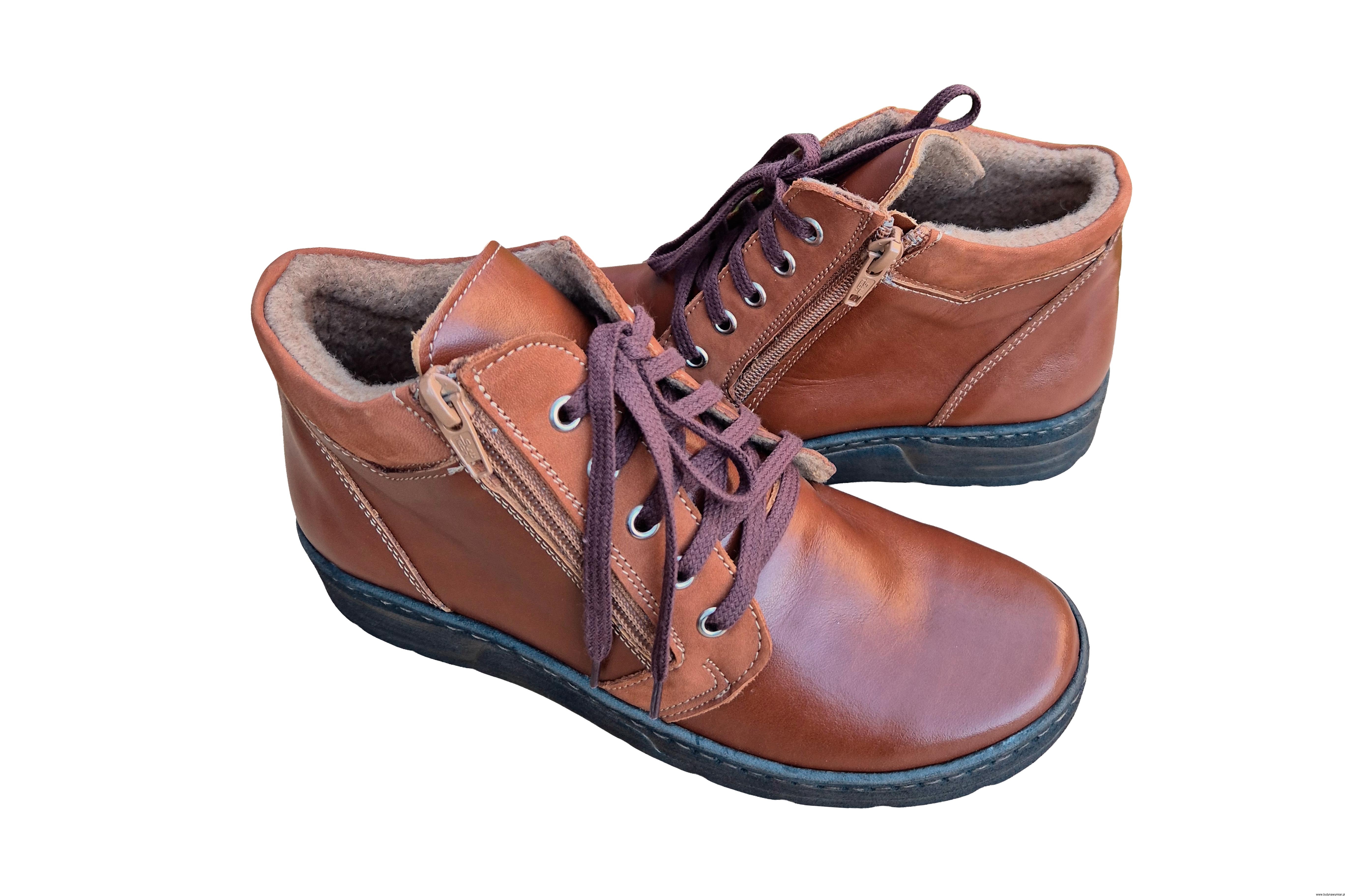 Modne i wygodne brązowe botki na zamek i sznurowane. ze skóry naturalnej ocieplane polarem.