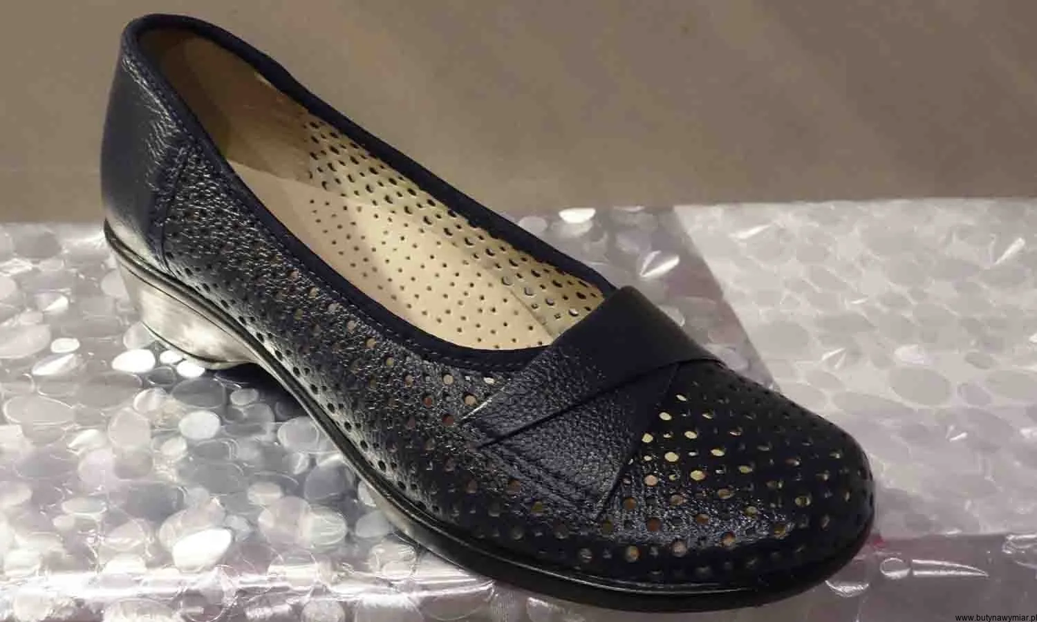 Modne i wygodne czółenko ażurkowe w kolorze granatowym wsuwane wykonane ze skóry naturalnej.