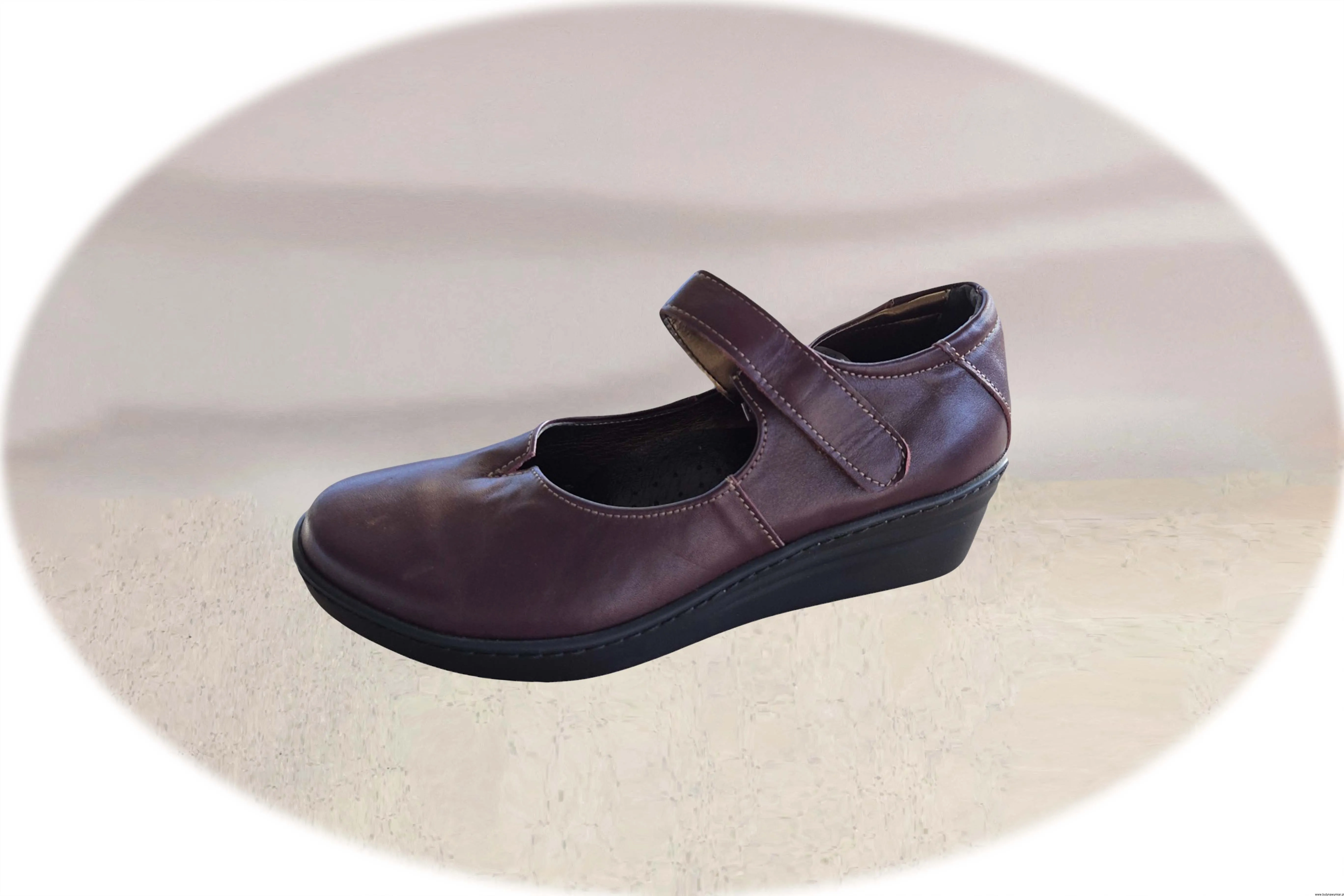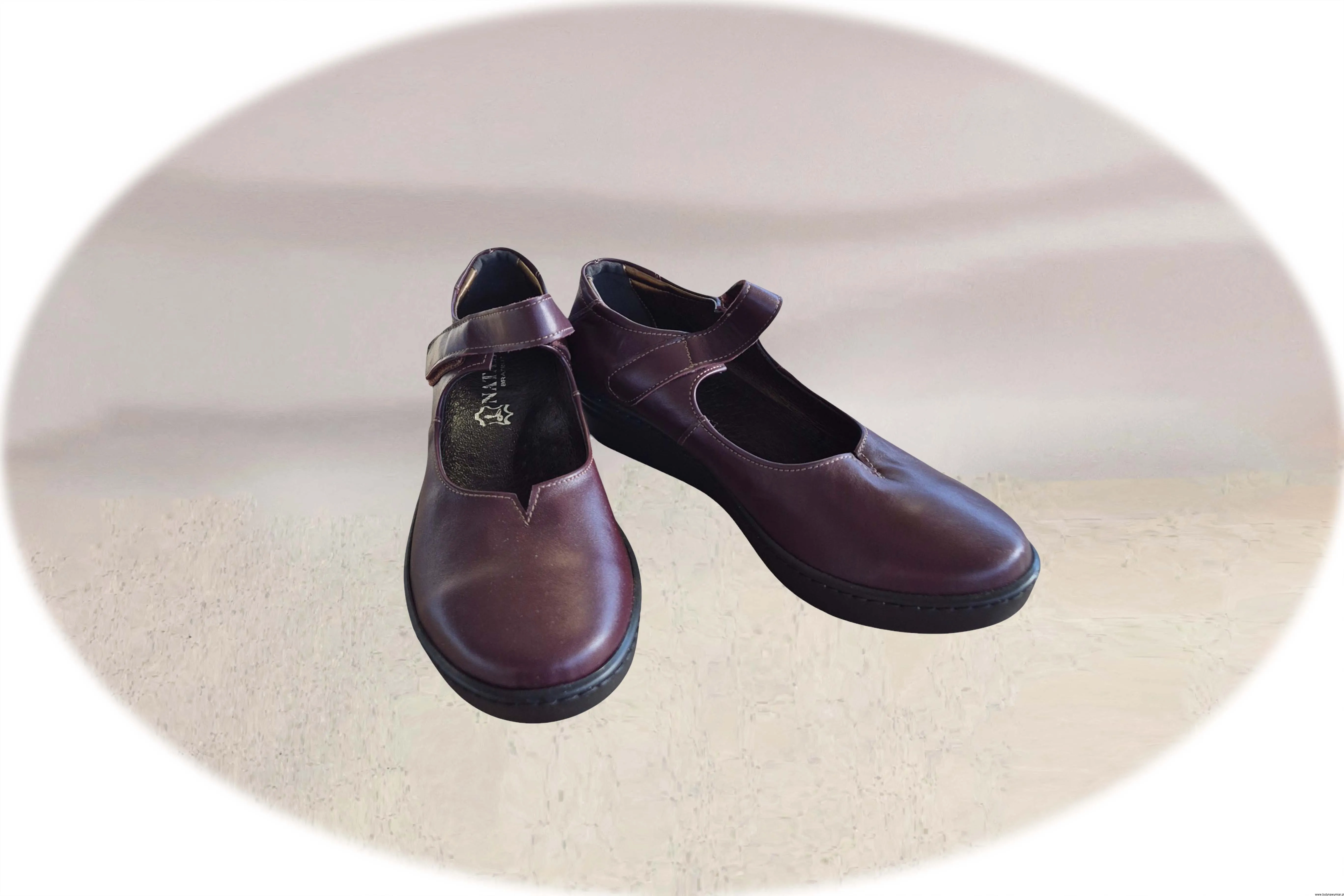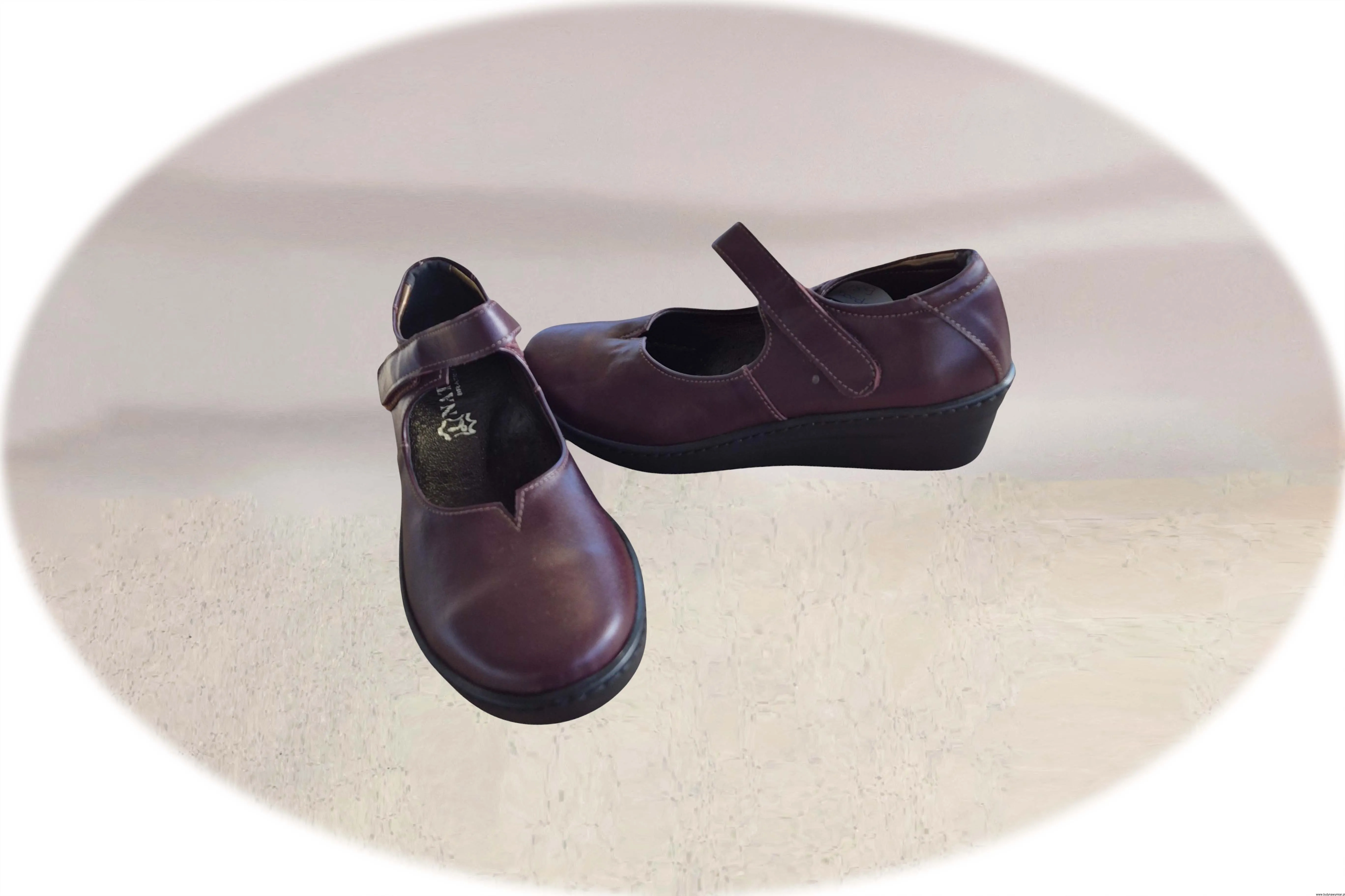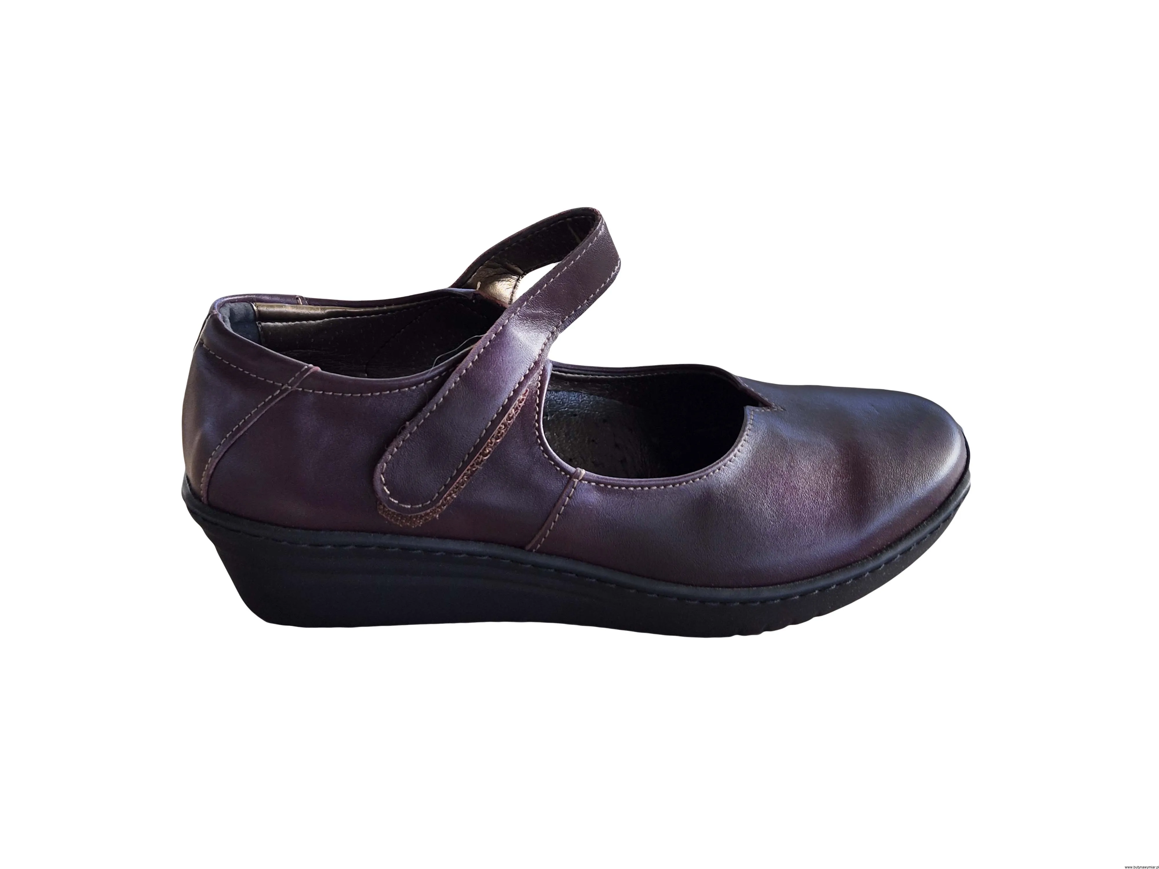 Wyjątkowe i eleganckie czółenka damskie w kolorze bordowym zapinane na rzepy na koturnie wykonane ze skóry naturalnej.