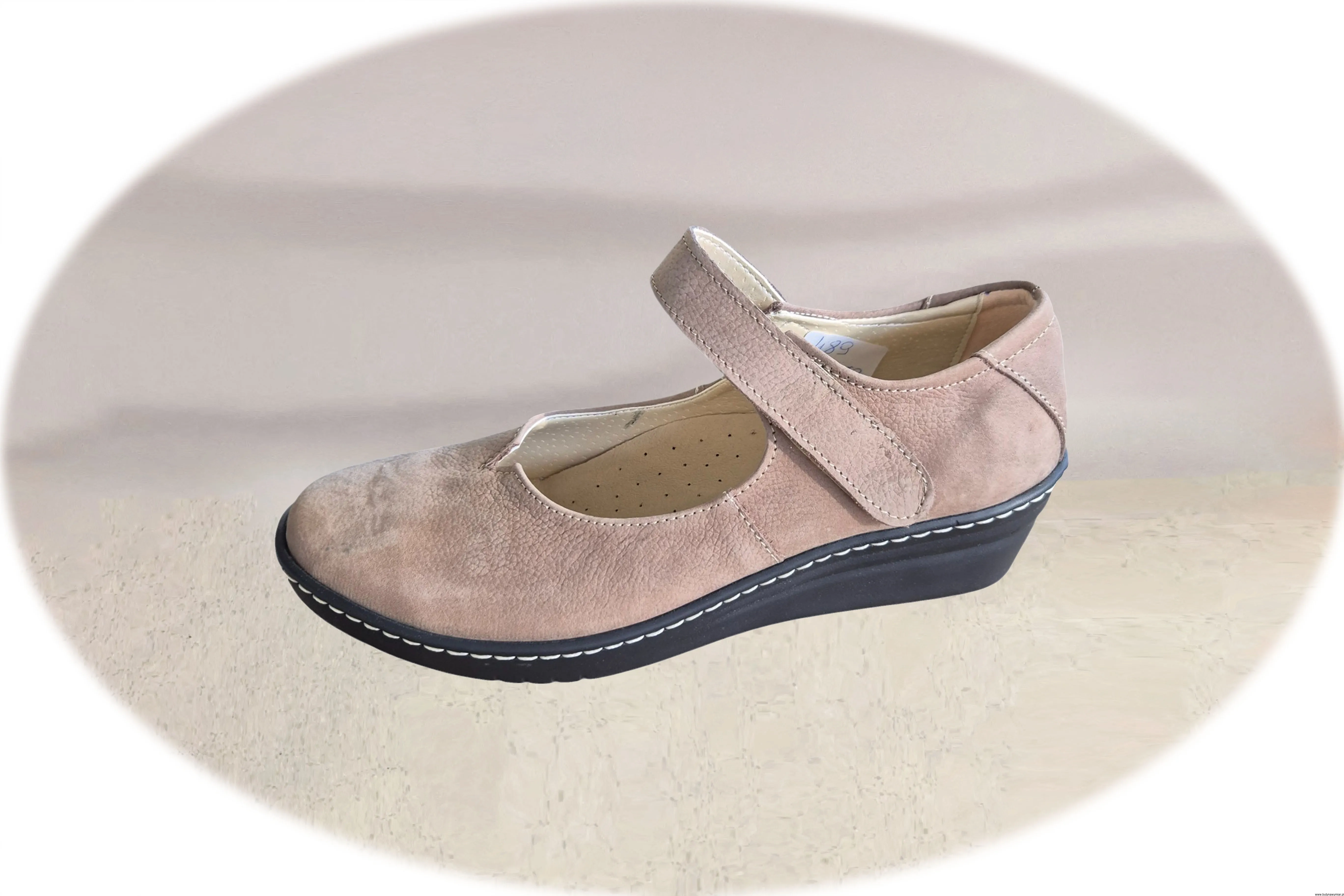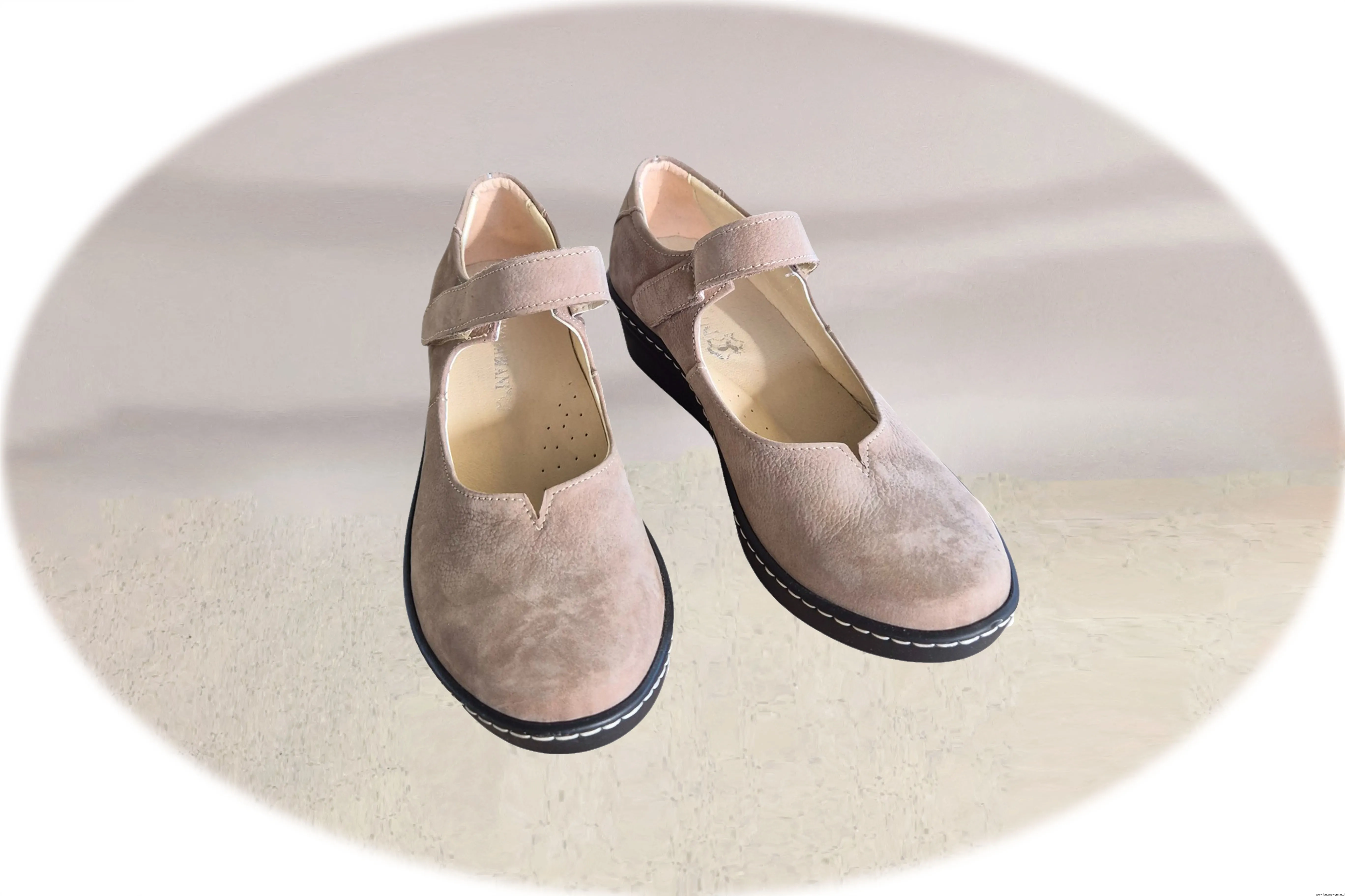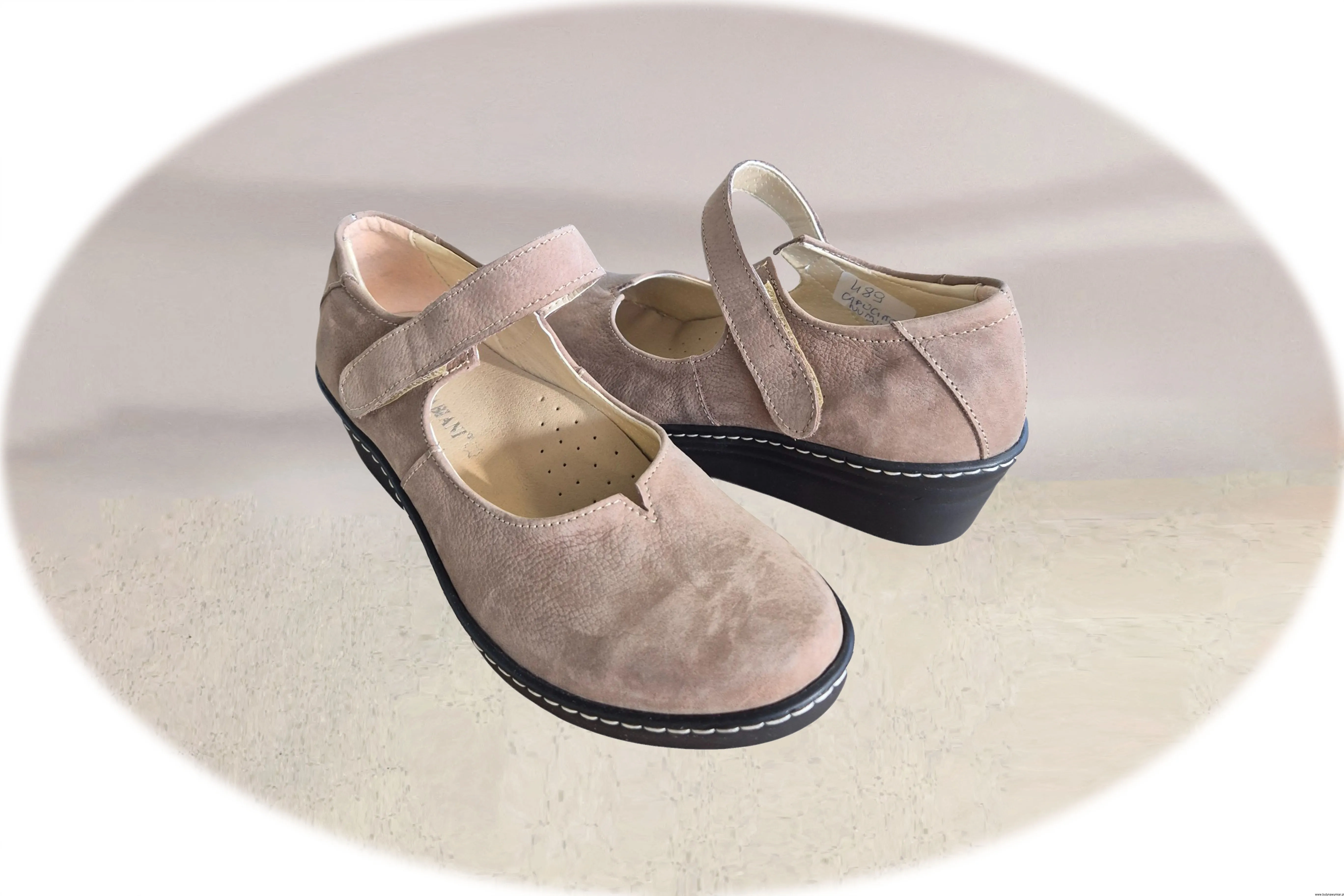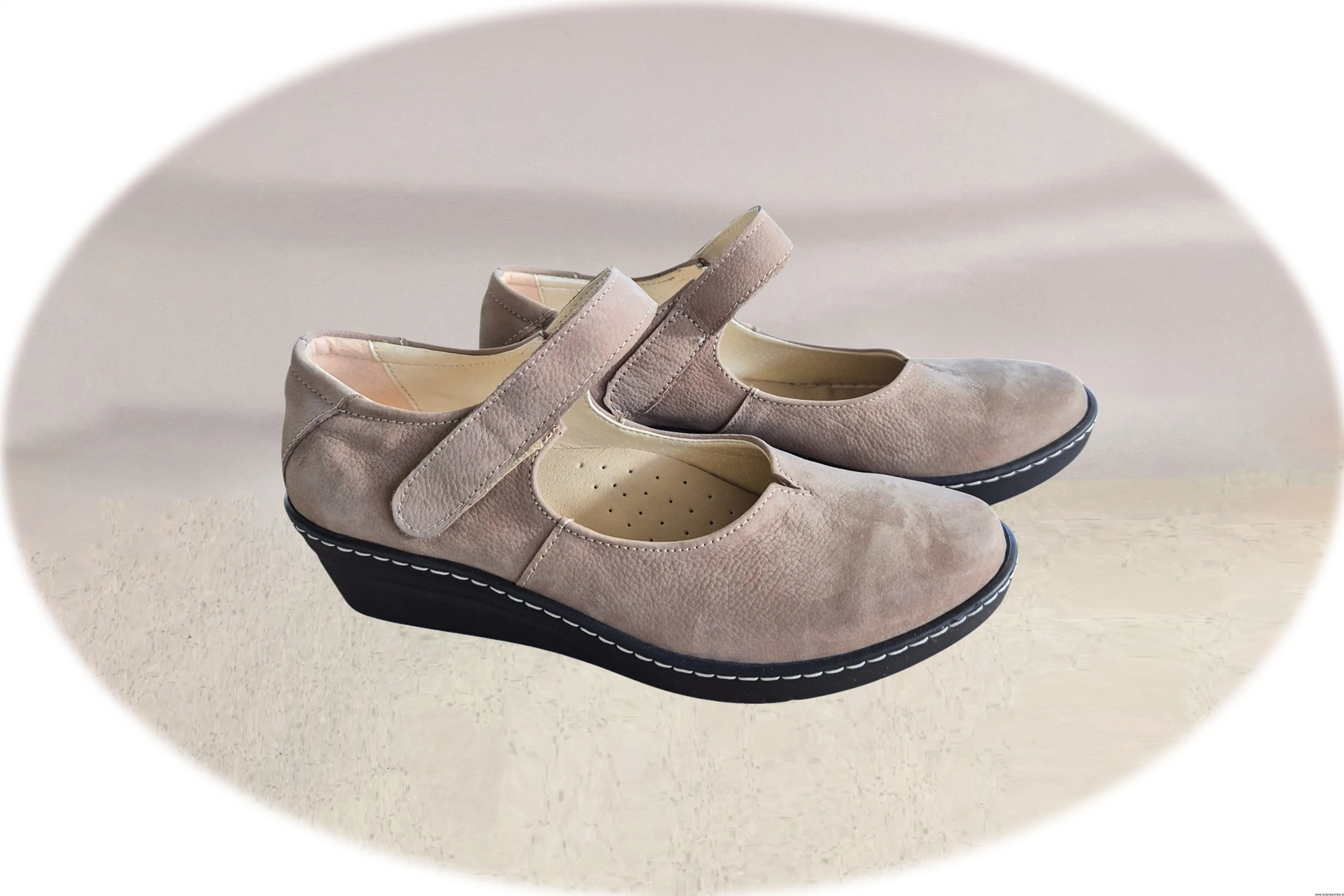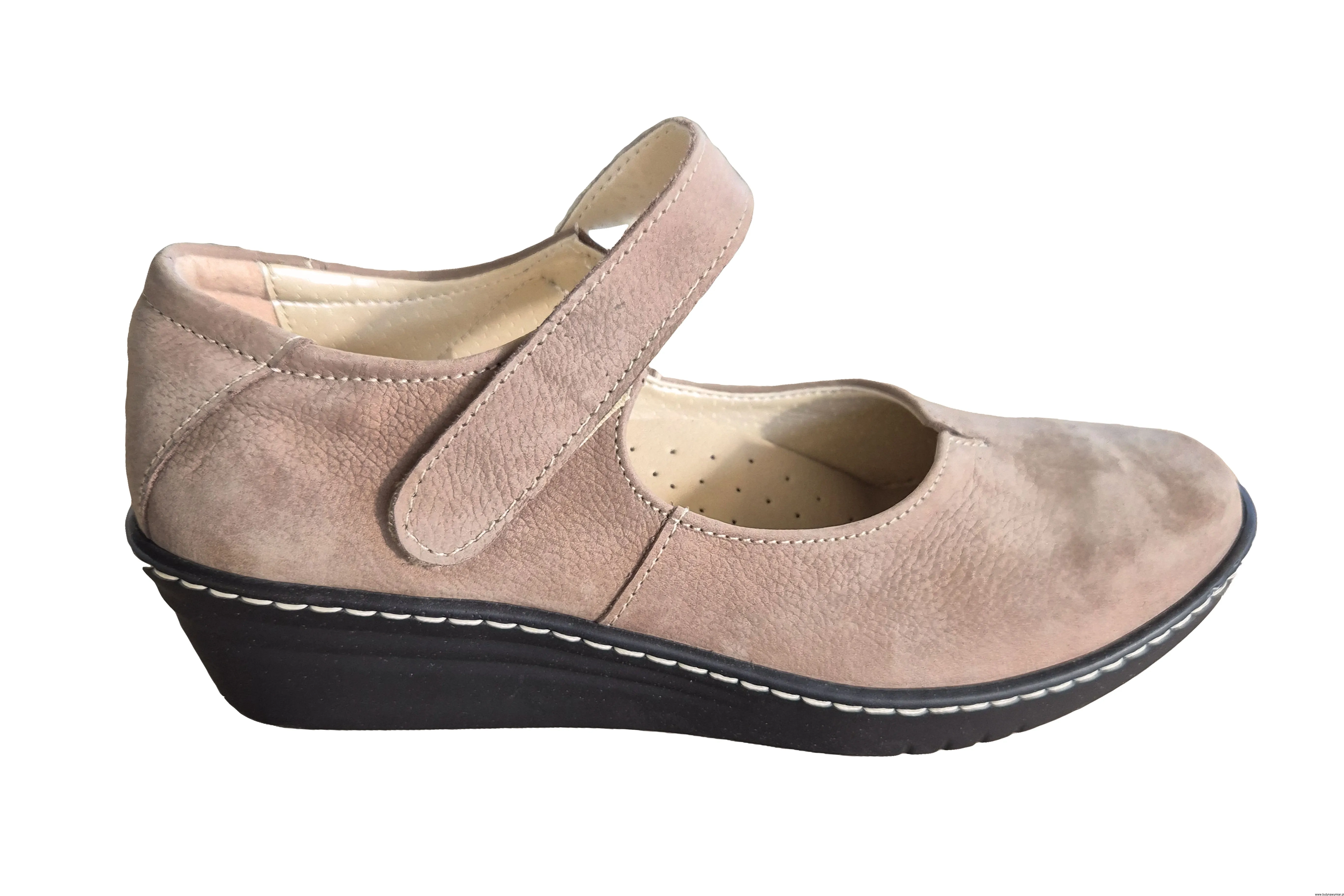 Wyjątkowe i eleganckie czółenka damskie w kolorze cappuccino zapinane na rzepy na koturnie wykonane ze skóry naturalnej.