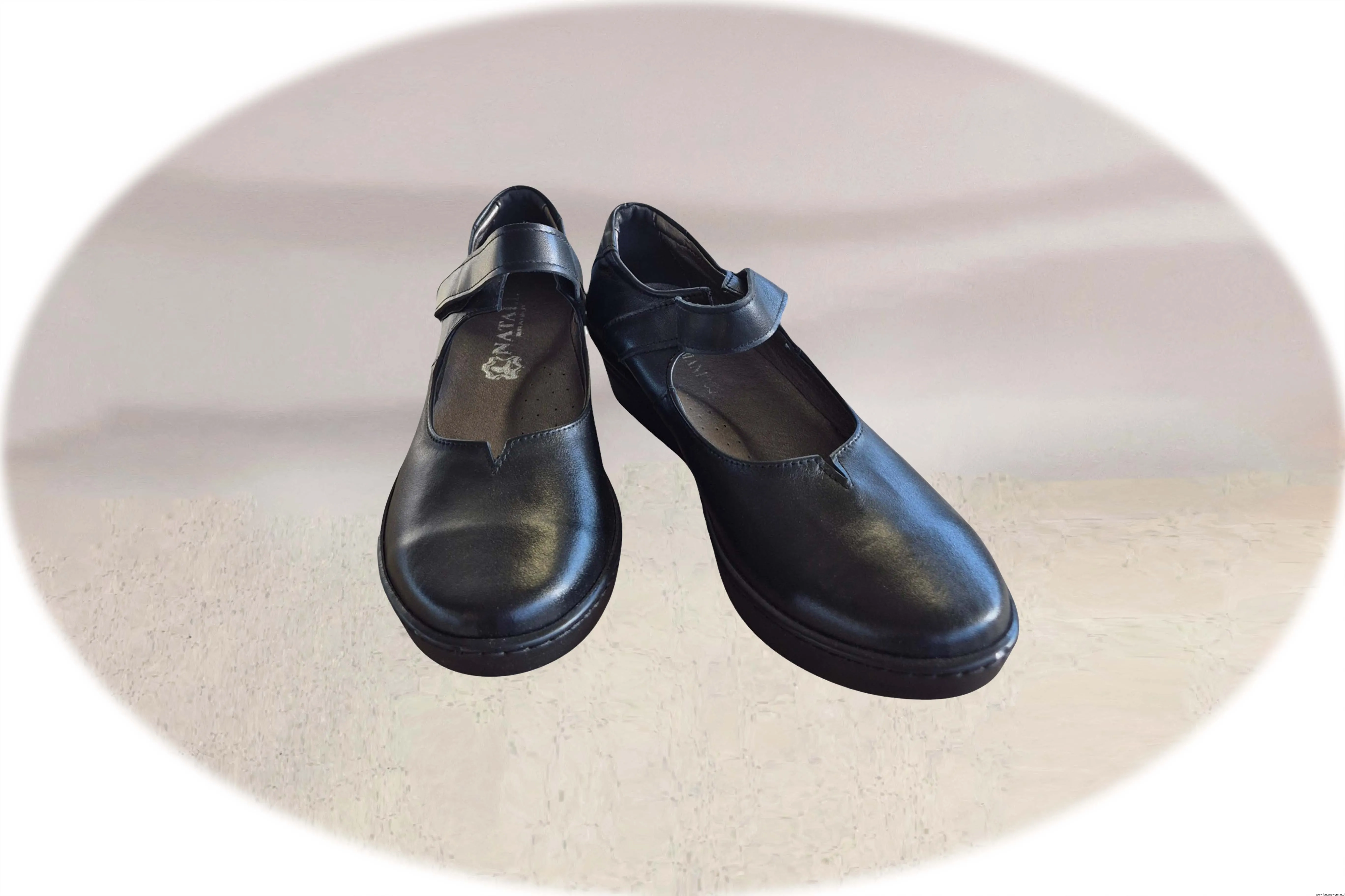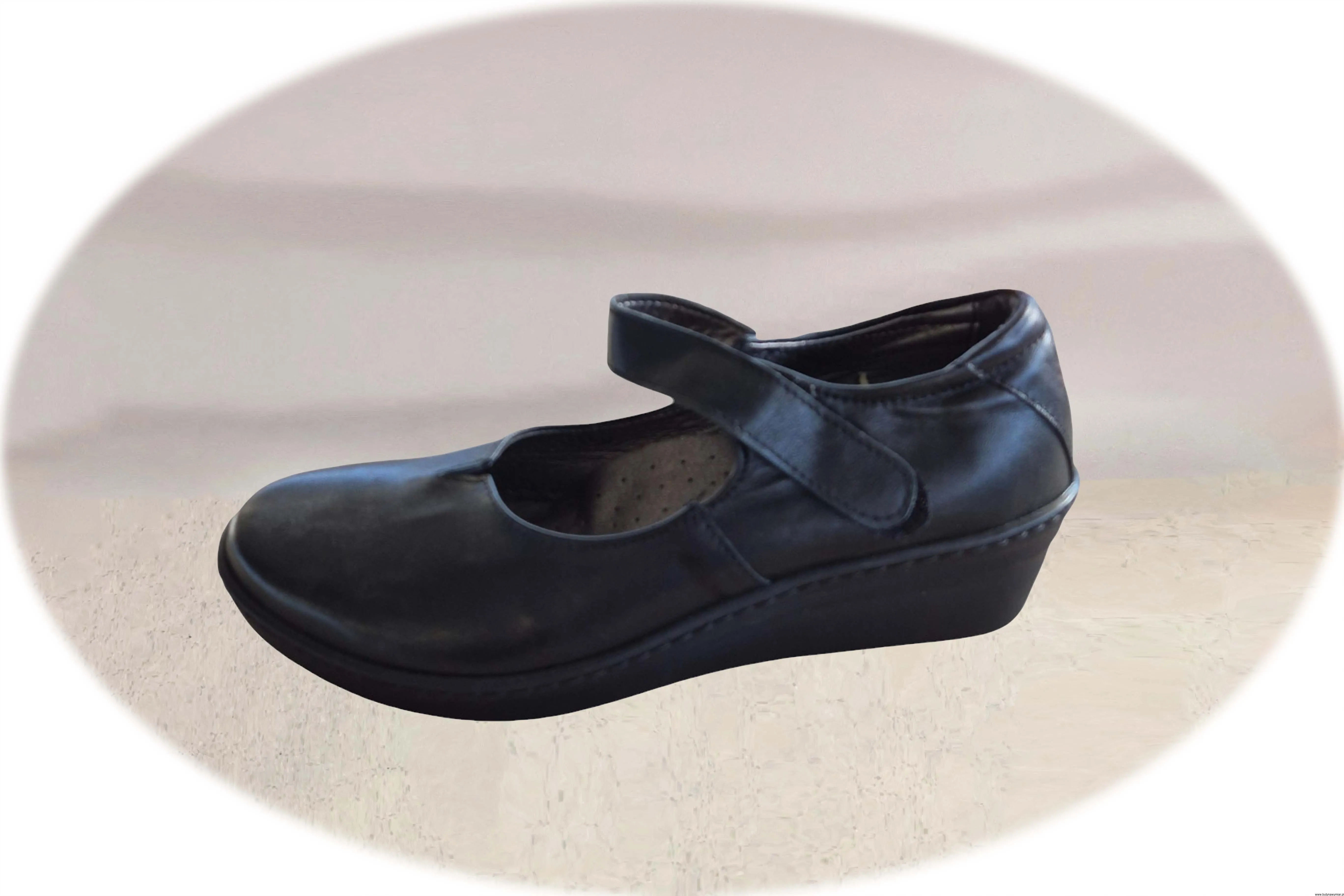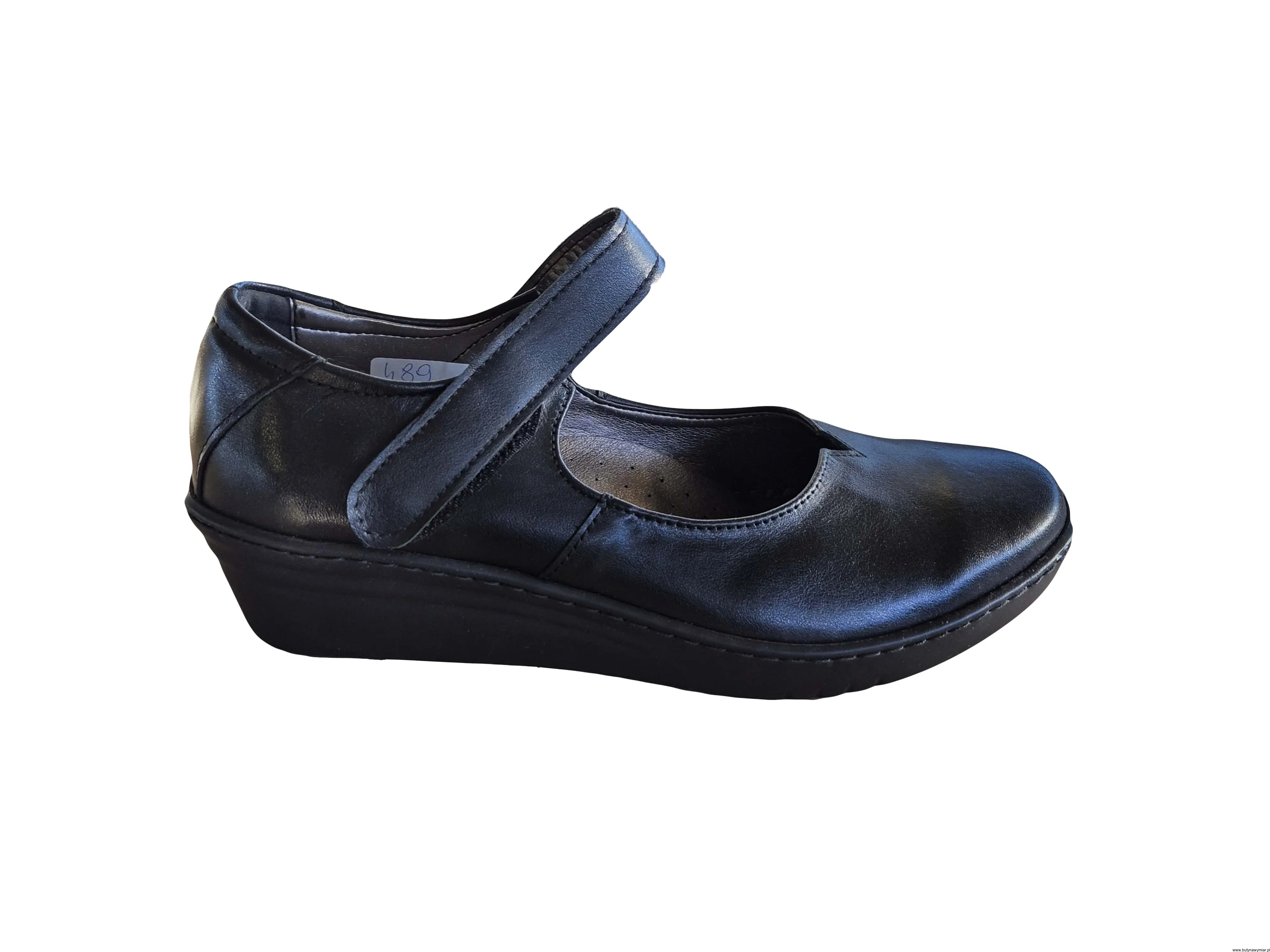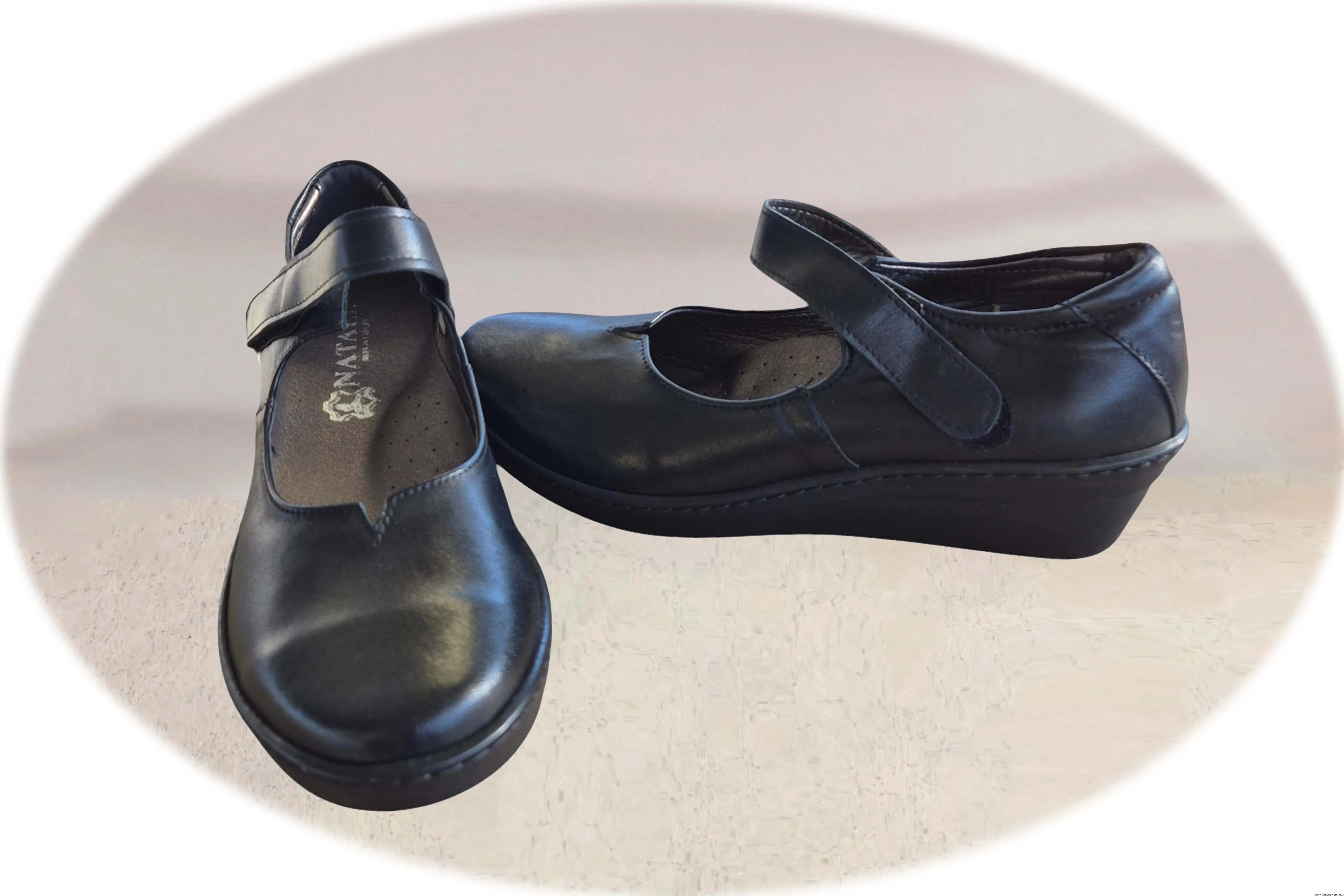 Wyjątkowe i eleganckie czółenka damskie w kolorze czarnym zapinane na rzepy na koturnie wykonane ze skóry naturalnej.