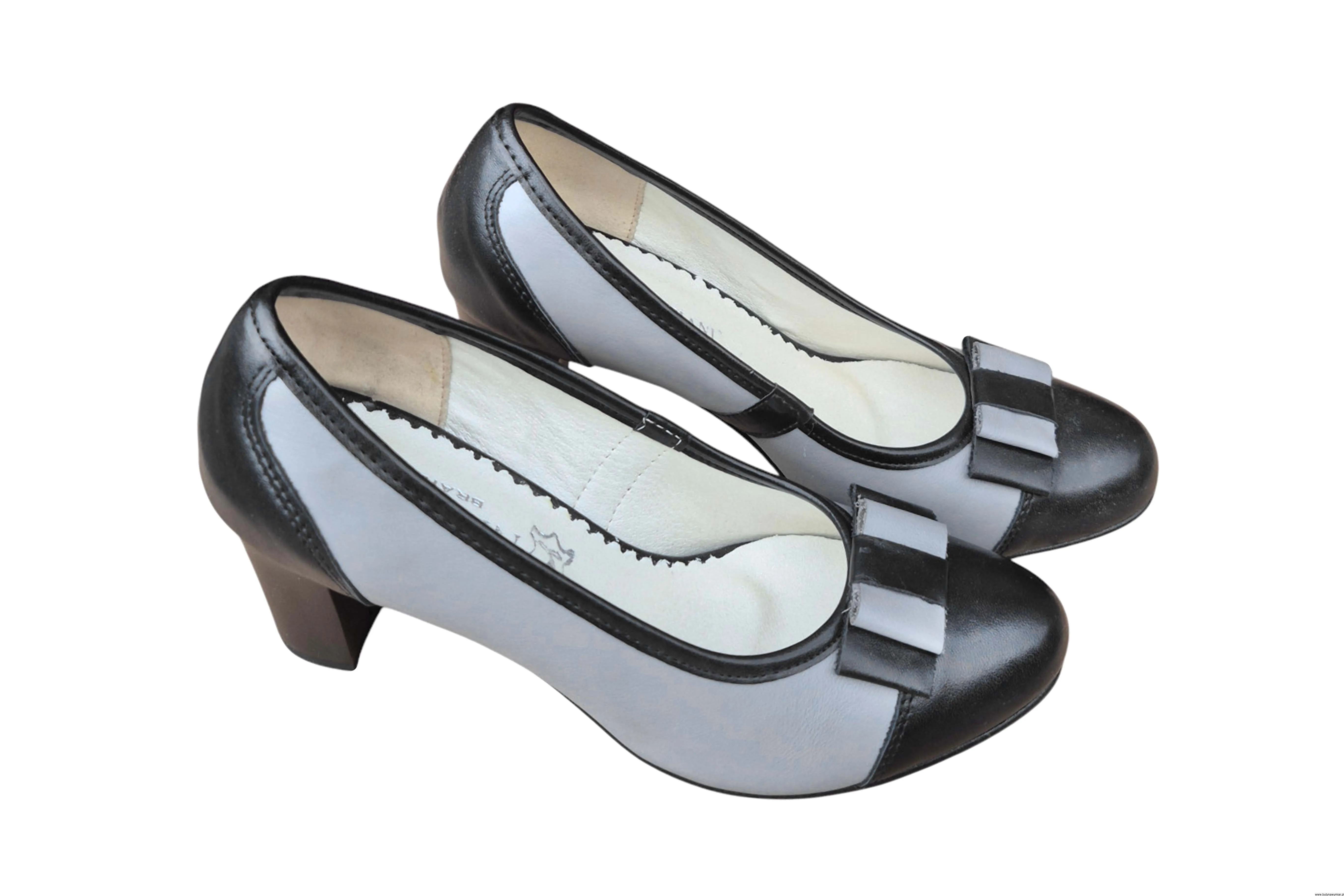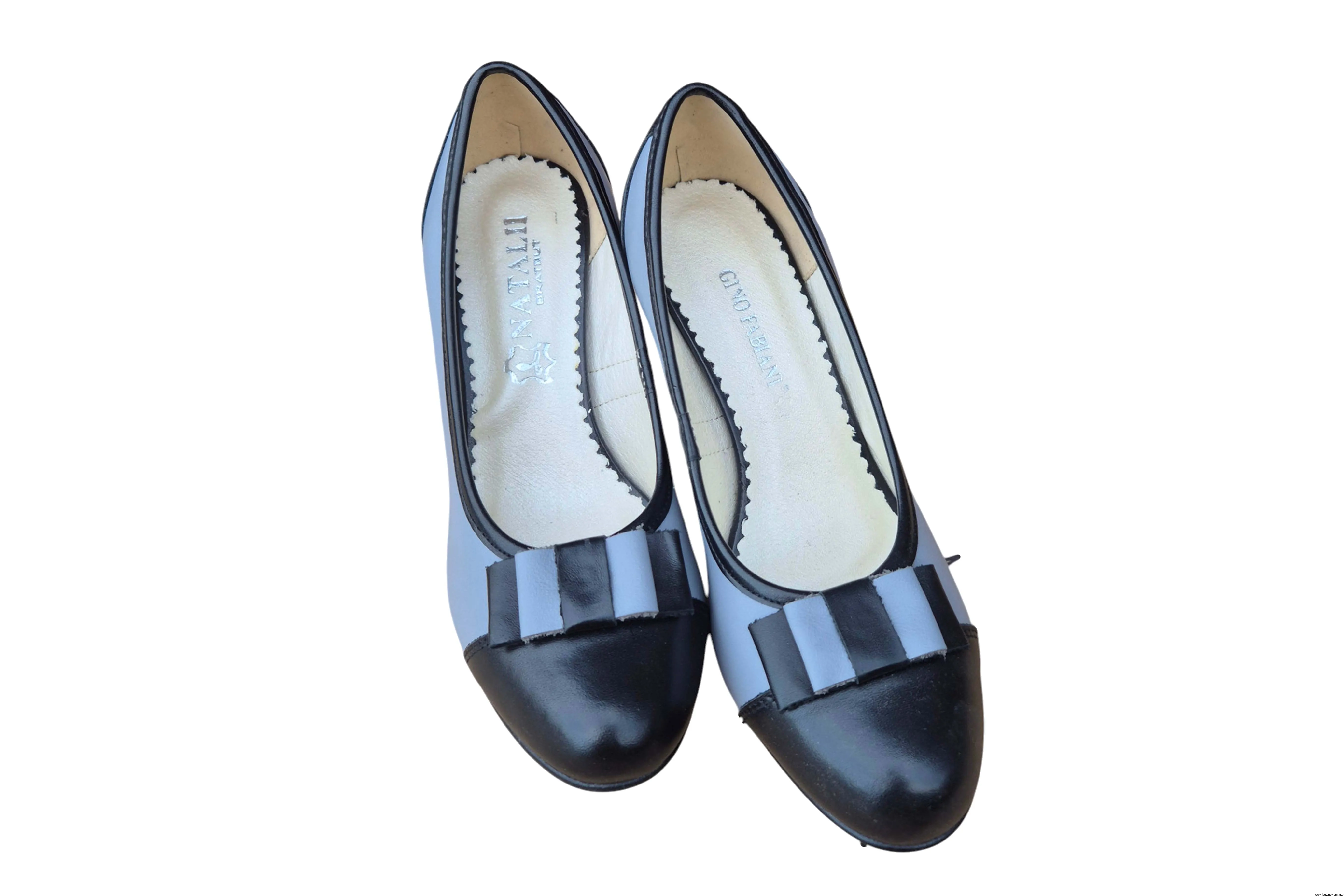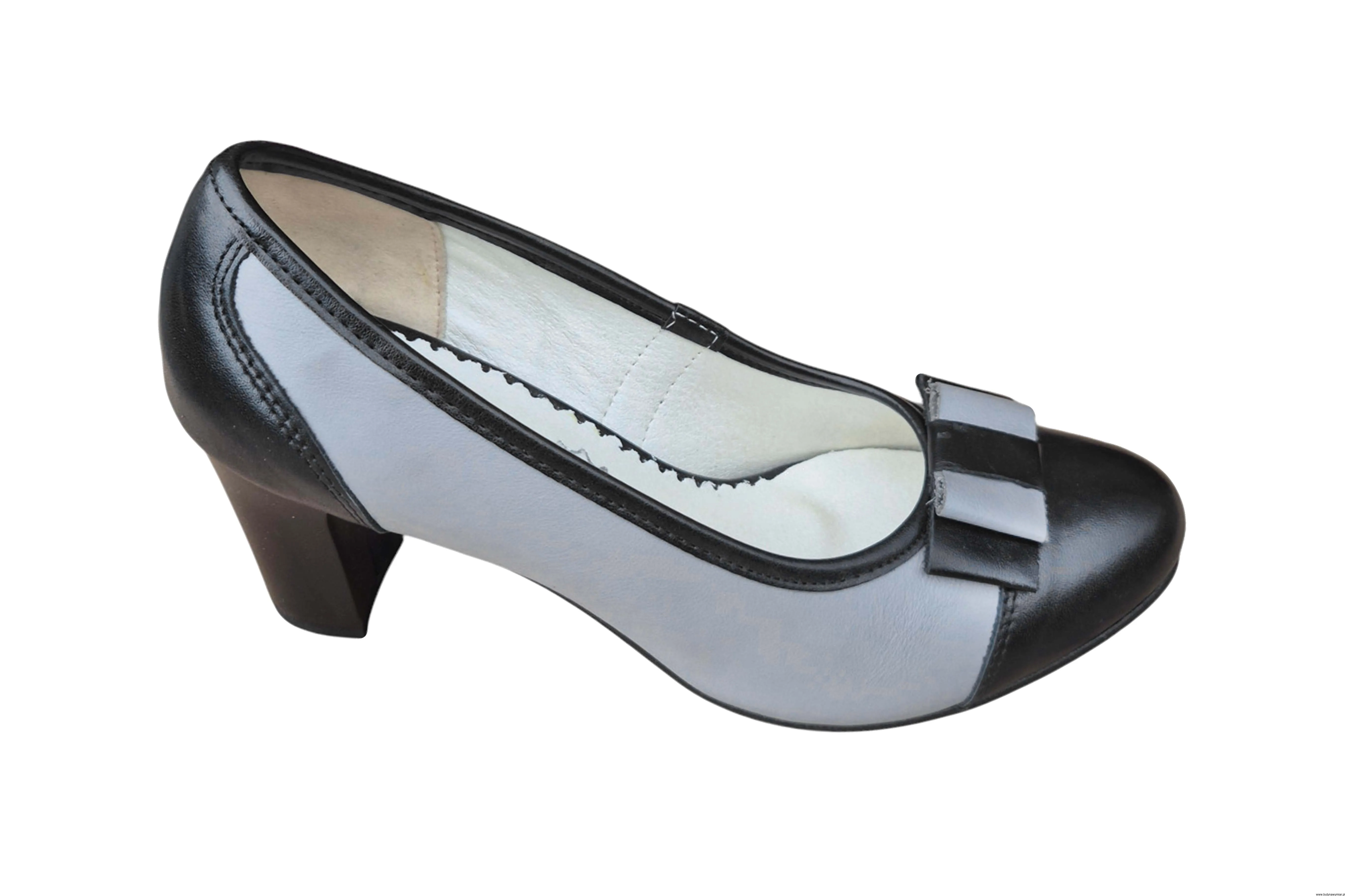 Wyjątkowe i eleganckie czółenka damskie w kolorze popielatym z czarnymi wstawkami wsuwane wykonane ze skóry naturalnej.