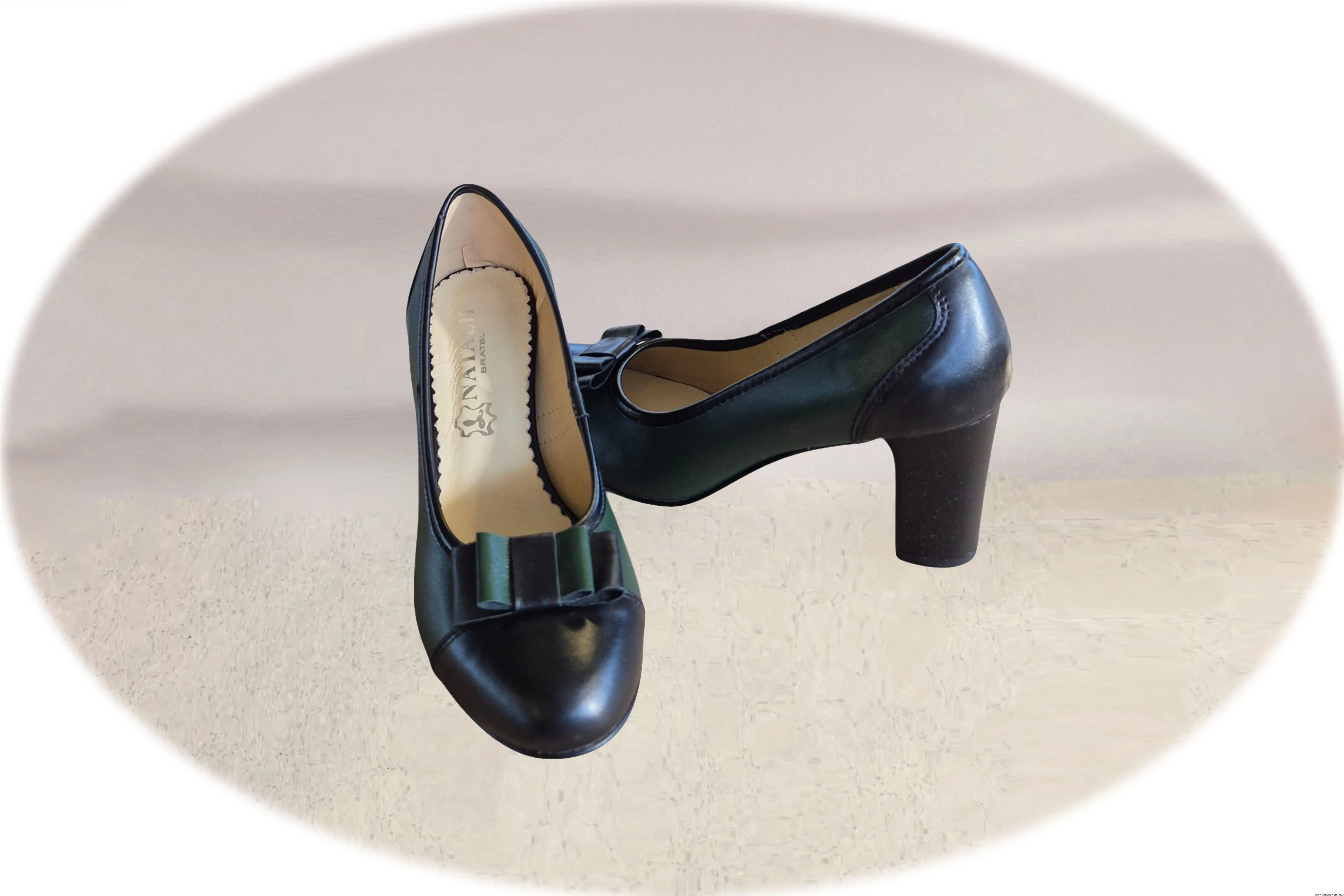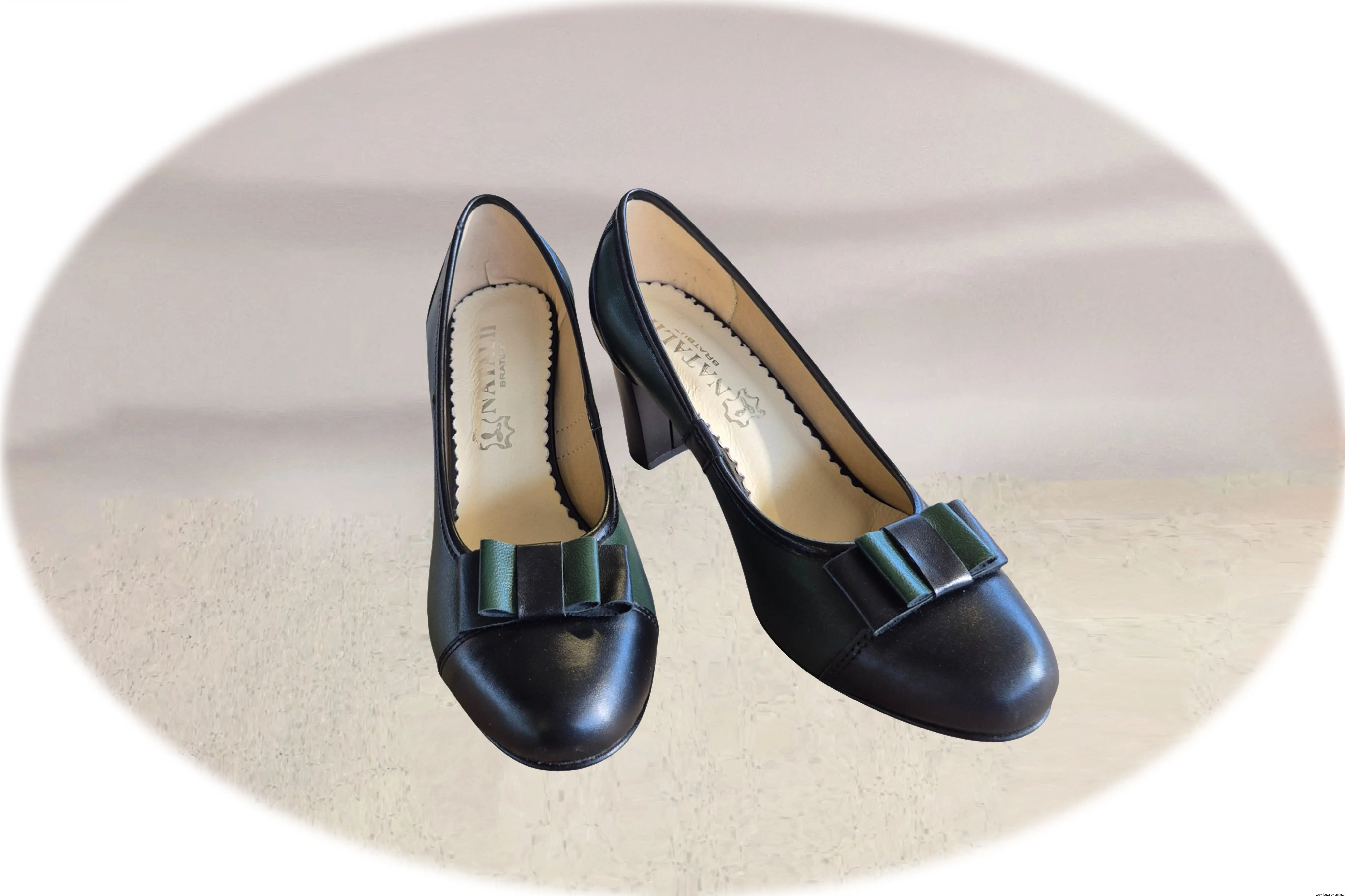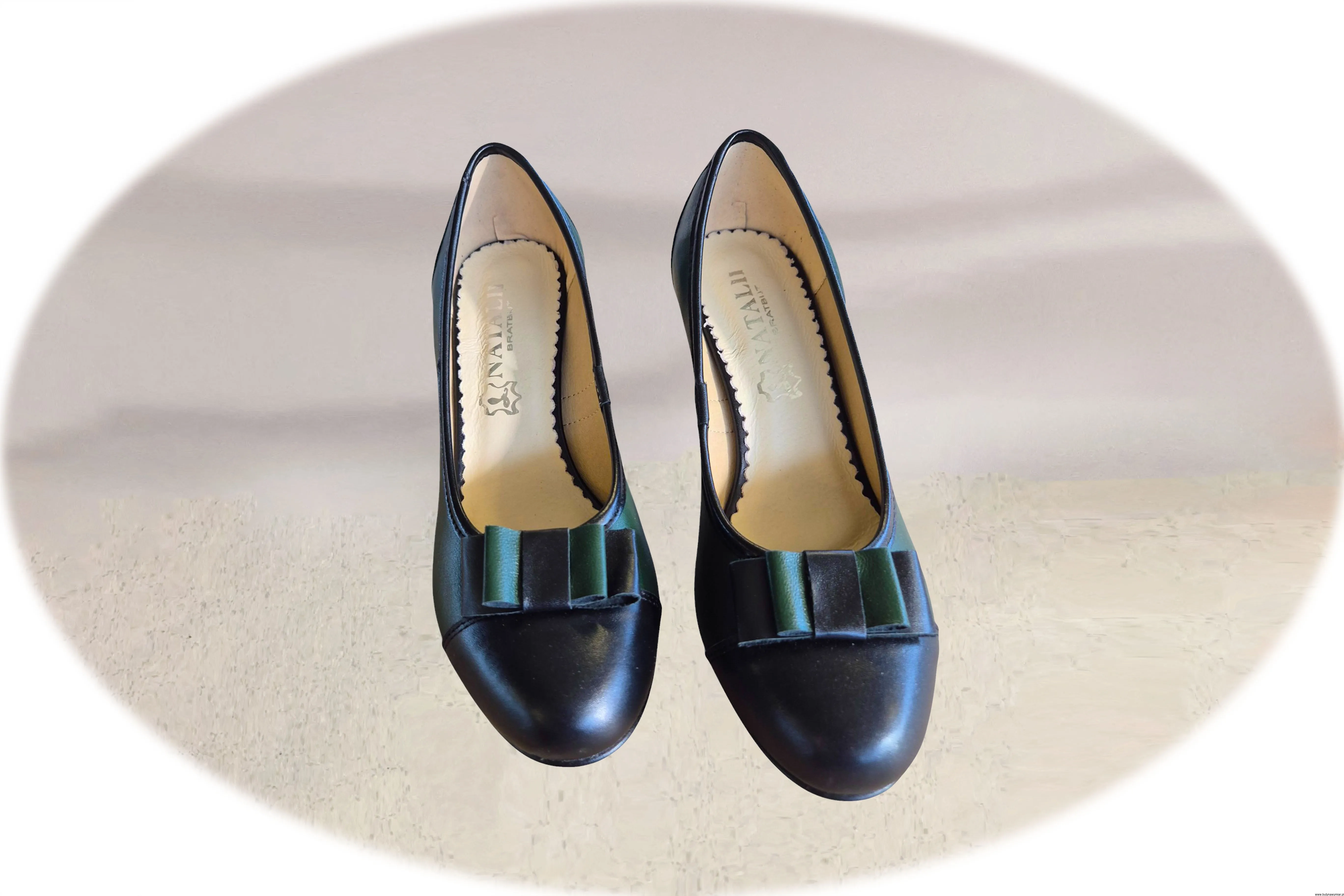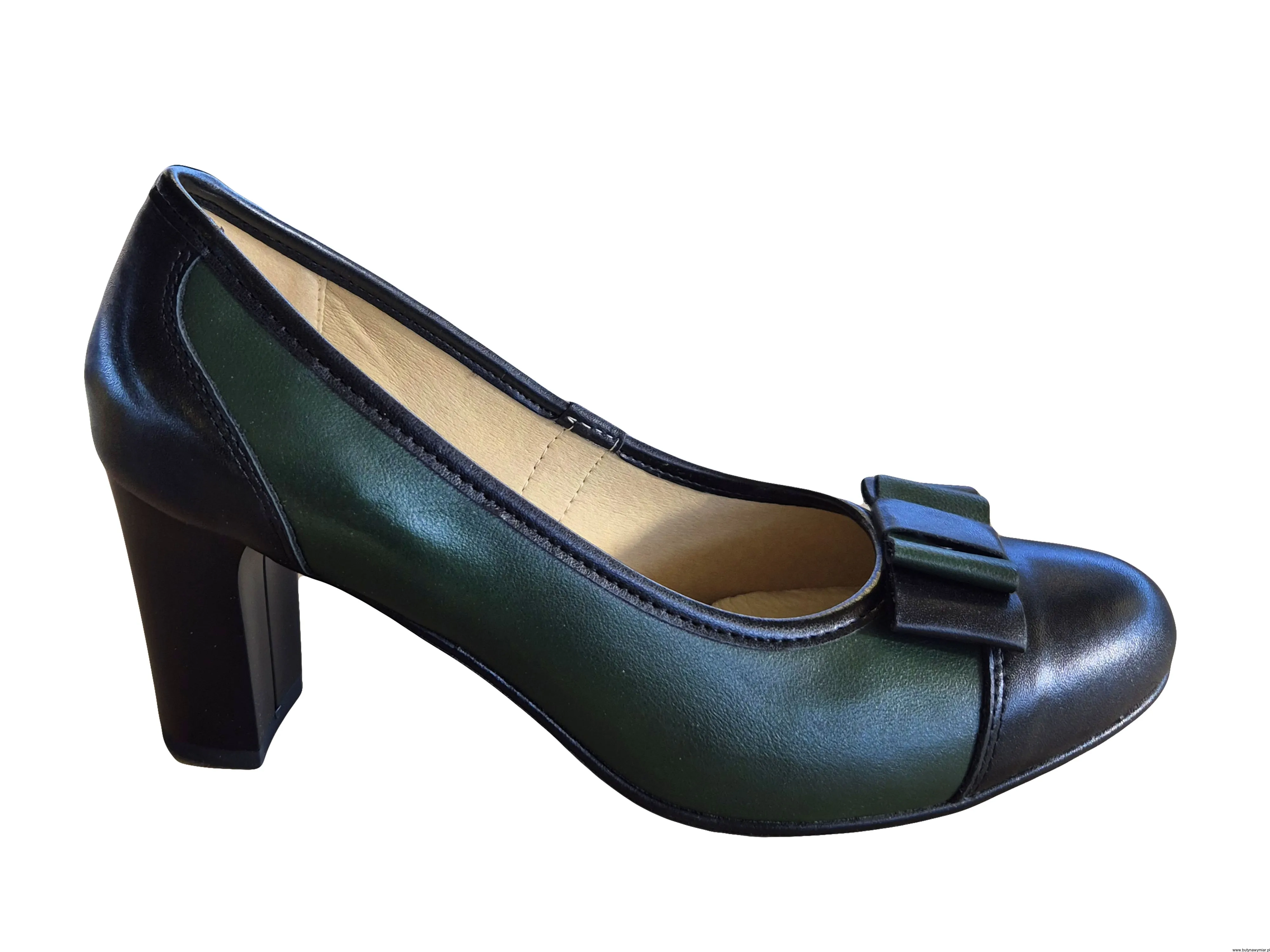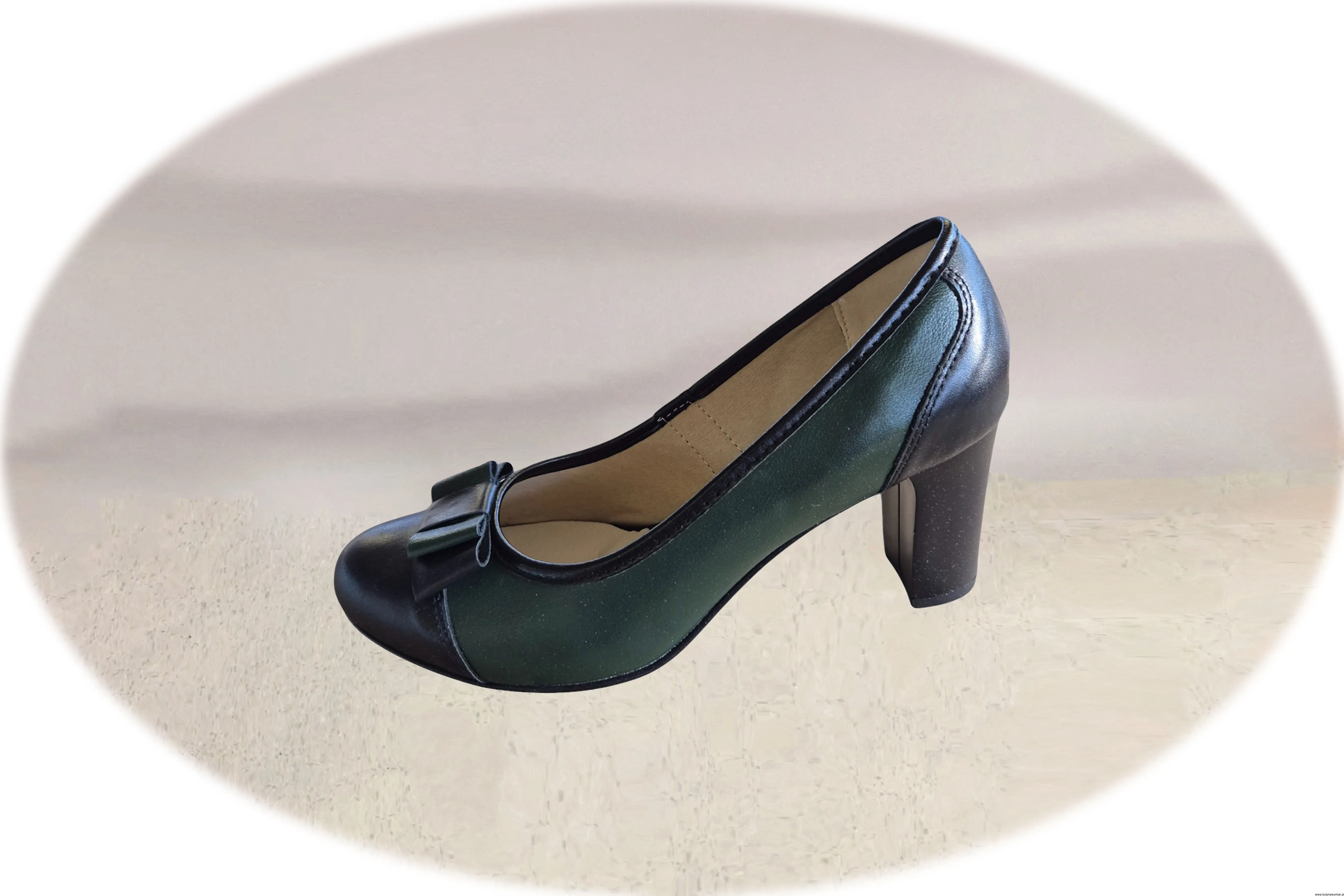 Wyjątkowe i eleganckie czółenka damskie w kolorze zielono czarnym, wsuwane wykonane ze skóry naturalnej.