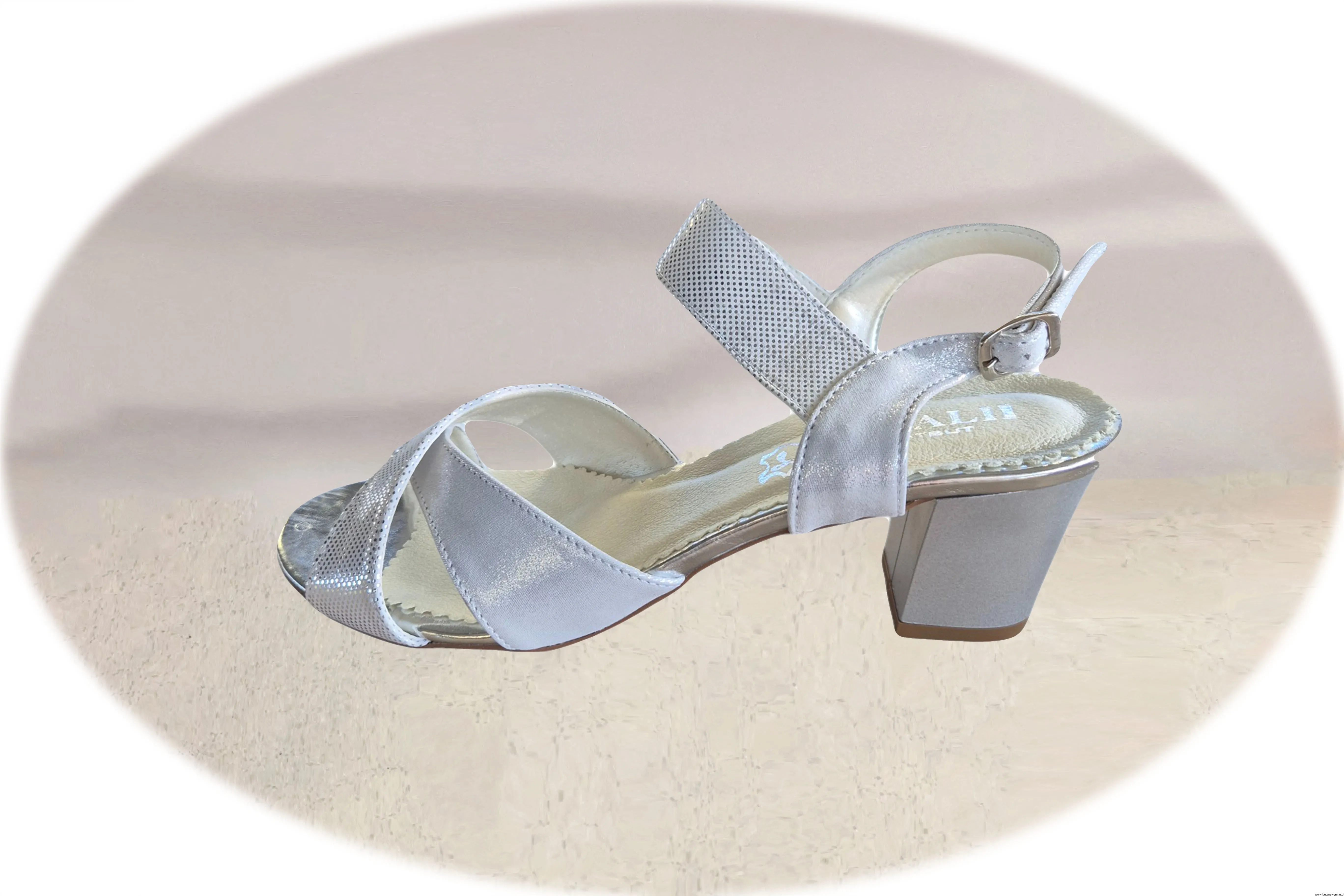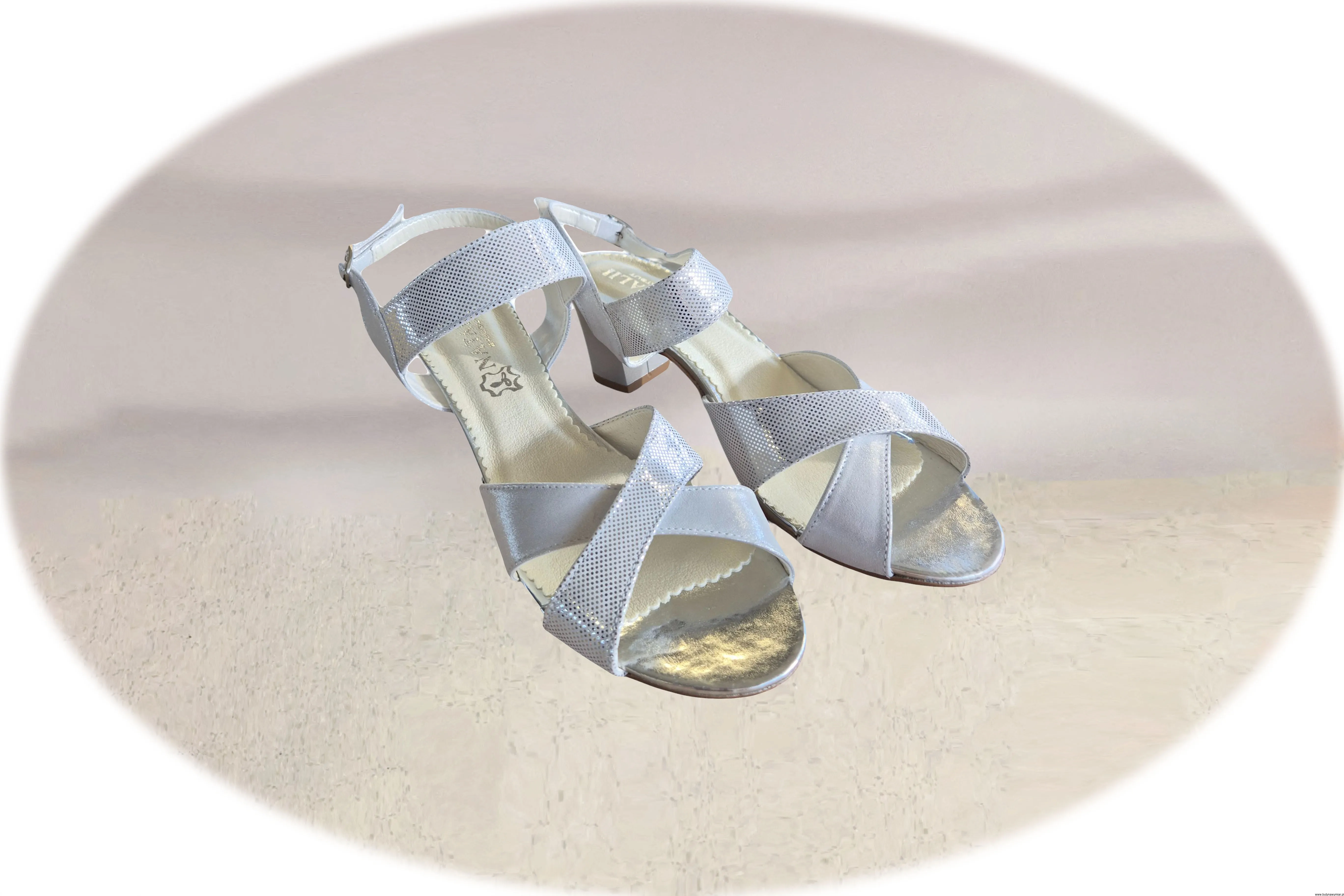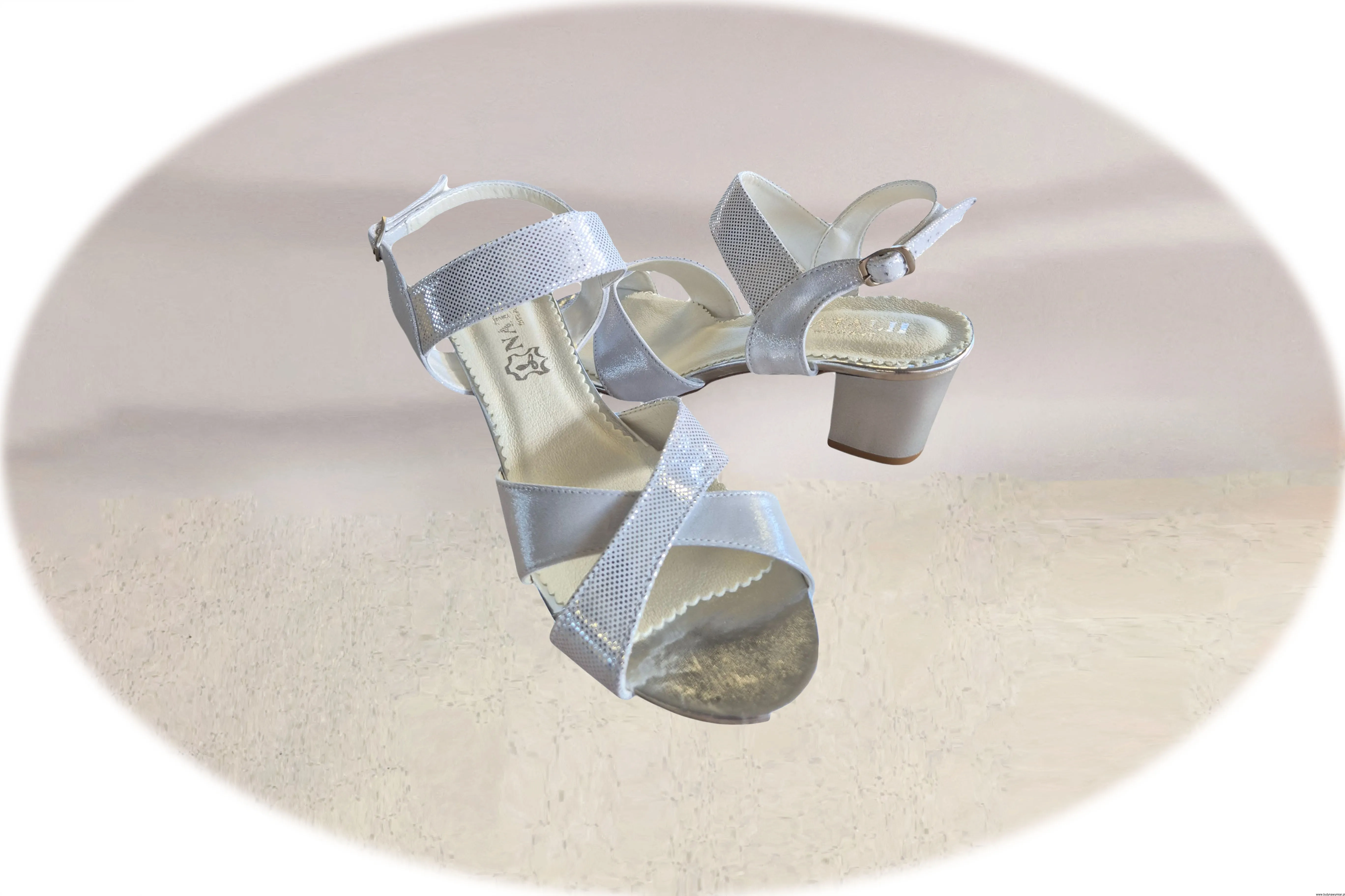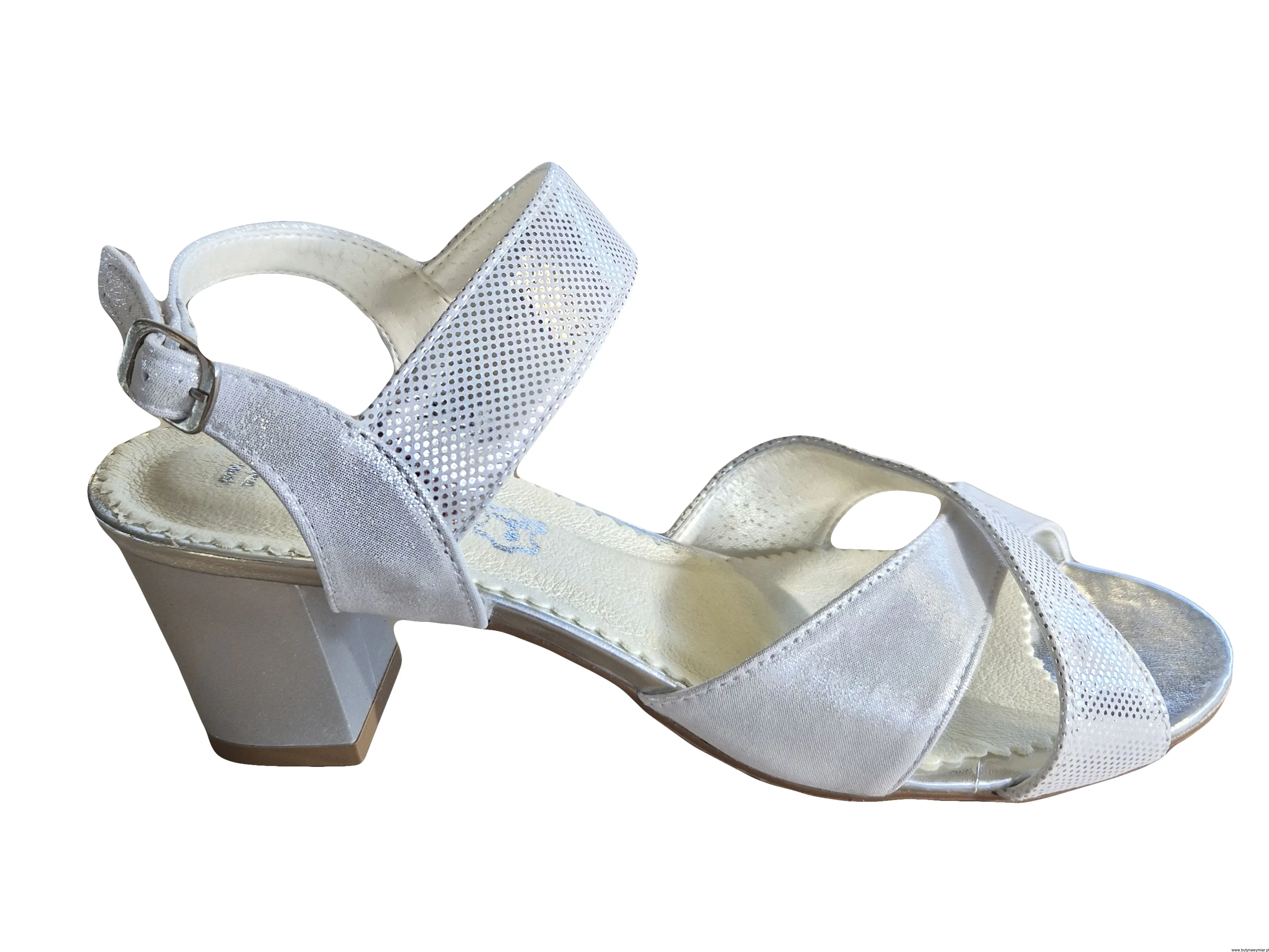 Modne i eleganckie sandały damskie w kolorze srebrnym zapinane na sprzączkę wykonane ze skóry naturalnej.