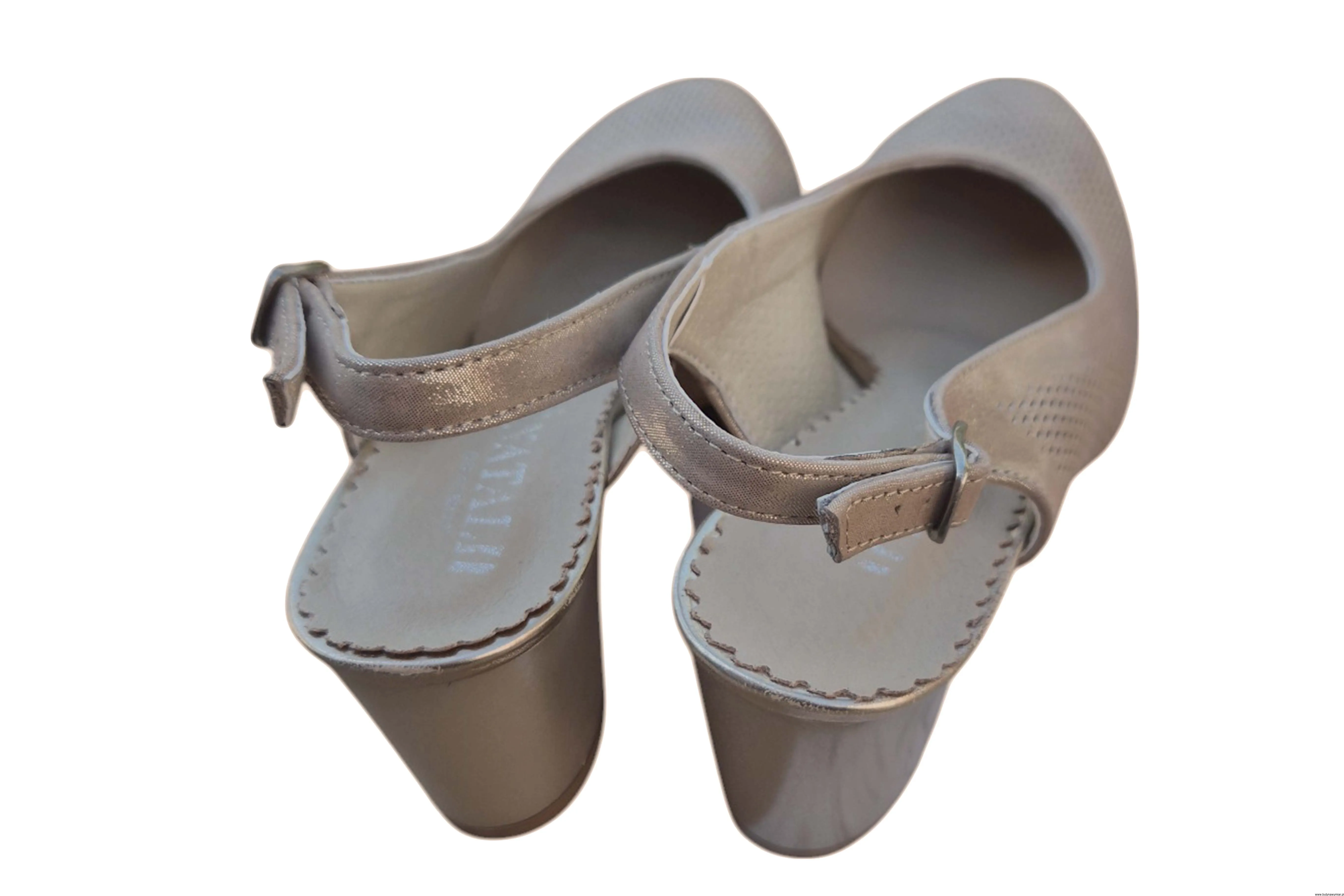Modne i eleganckie wyjątkowe sandały damskie w kolorze beżowym z wzorem na cholewce zapinane na sprzączkę wykonane ze skóry naturalnej.