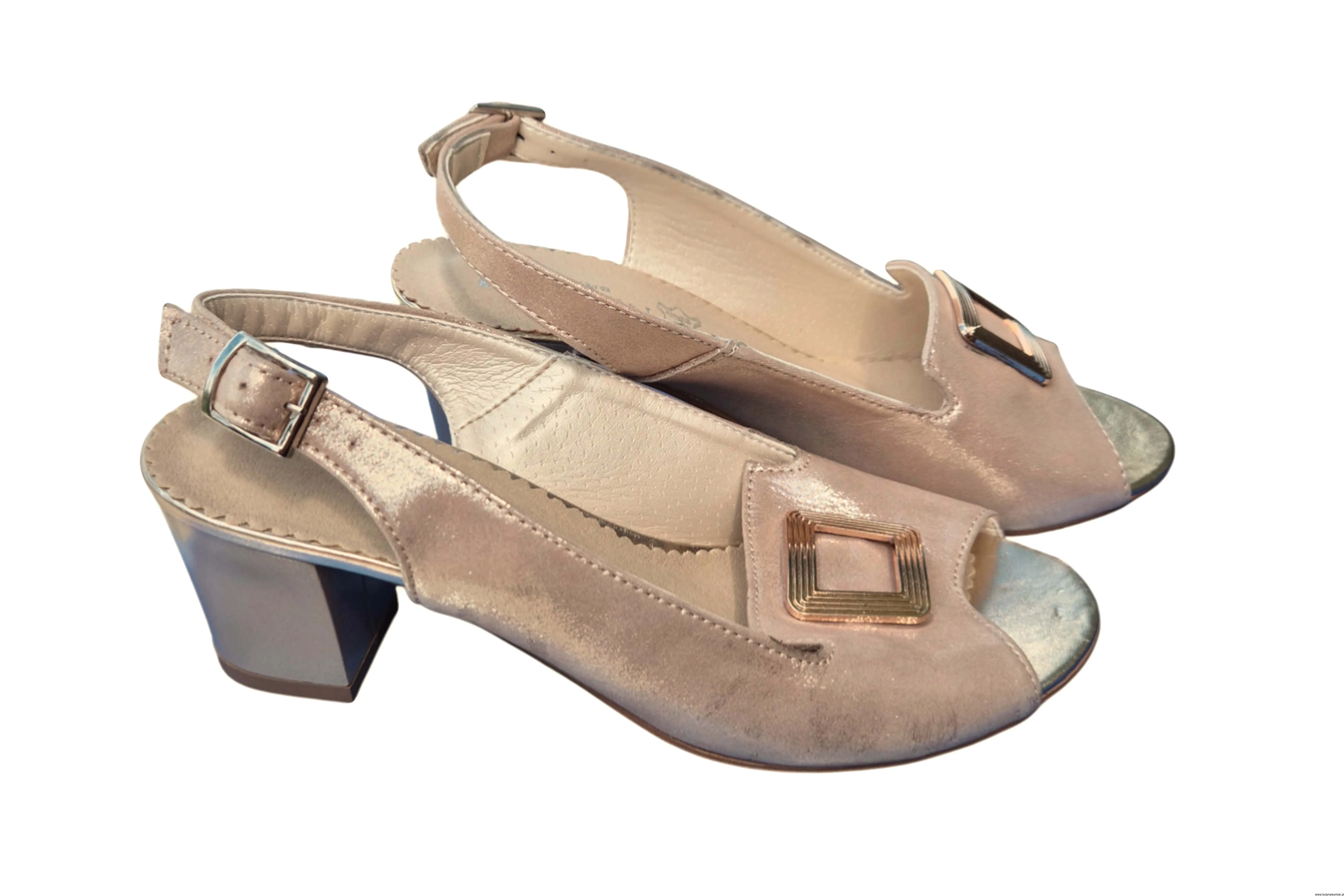 Modne i eleganckie wyjątkowe sandały damskie w kolorze beżowym z dekoracyjną klamrą, zapinane na sprzączkę wykonane ze skóry naturalnej.