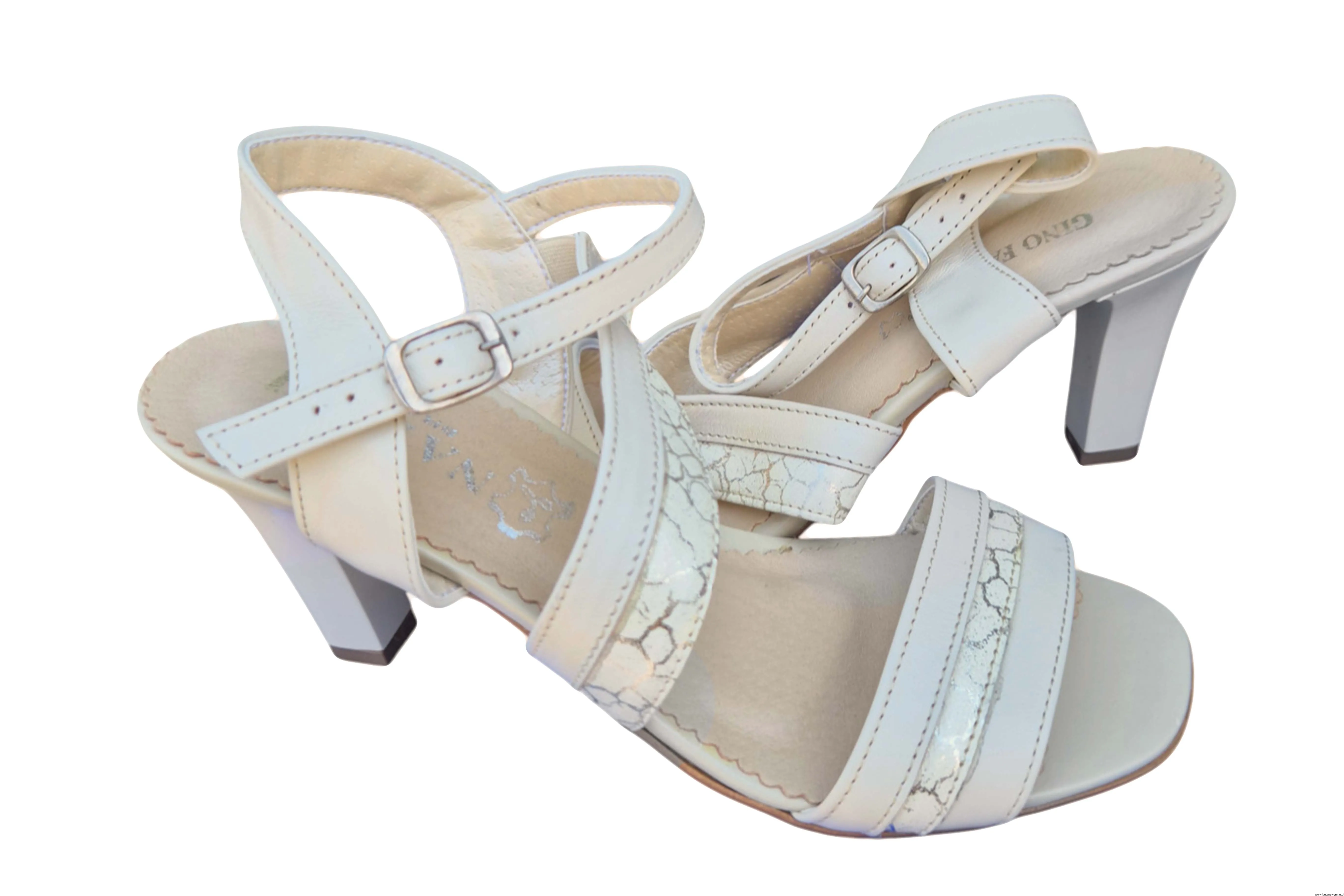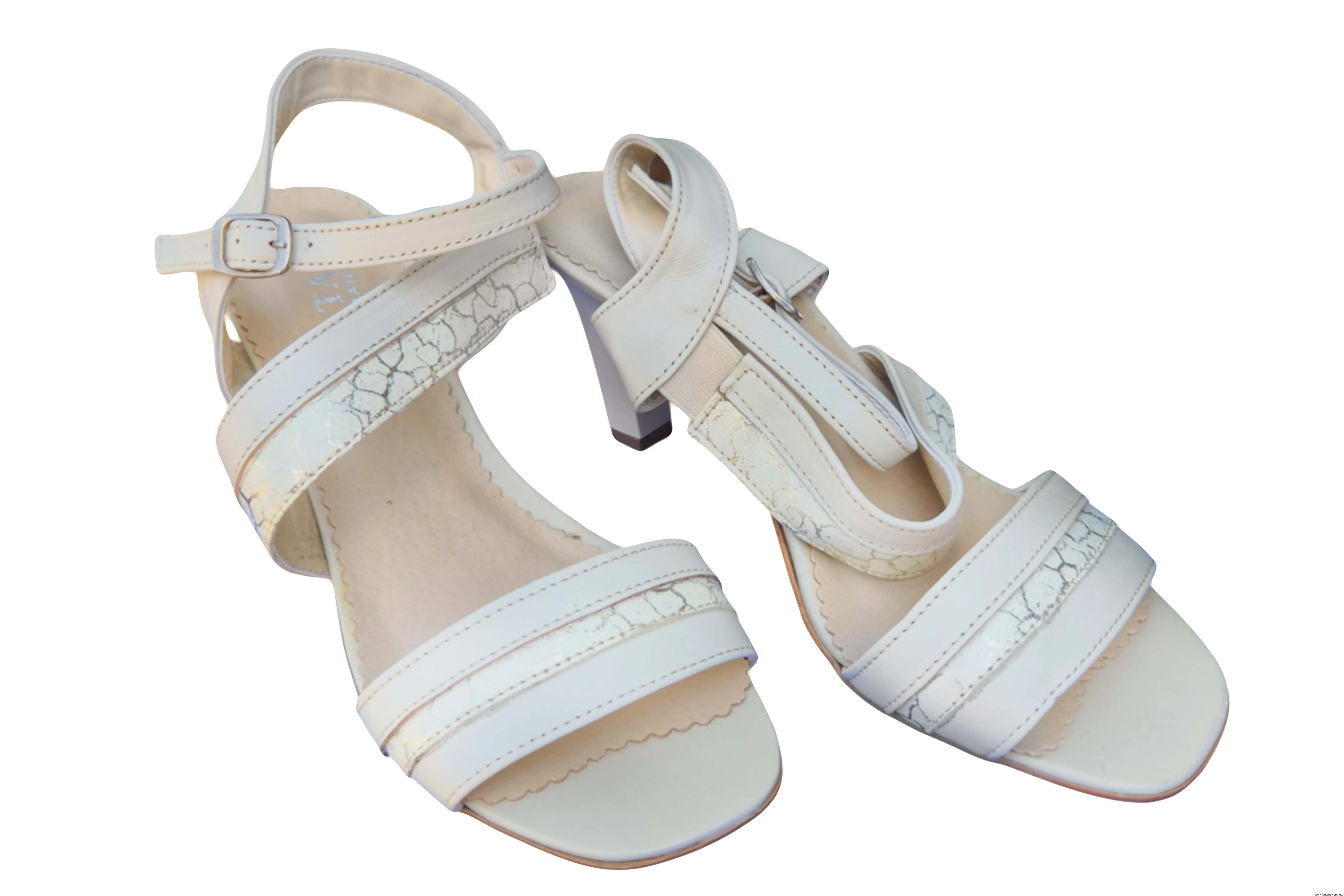 Modne i eleganckie sandały damskie w kolorze ecru zapinane na sprzączkę wykonane ze skóry naturalnej na wyższym słupku.