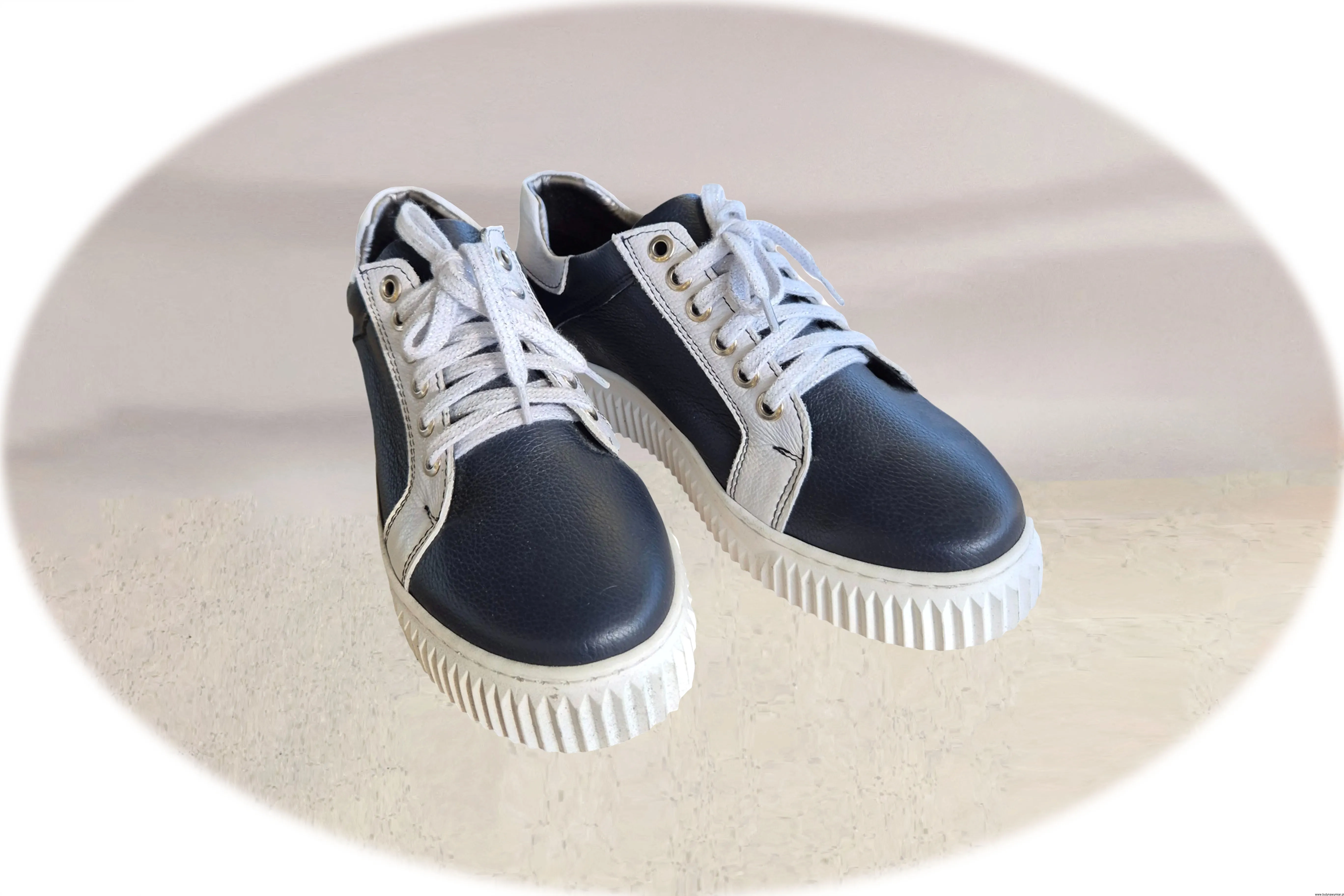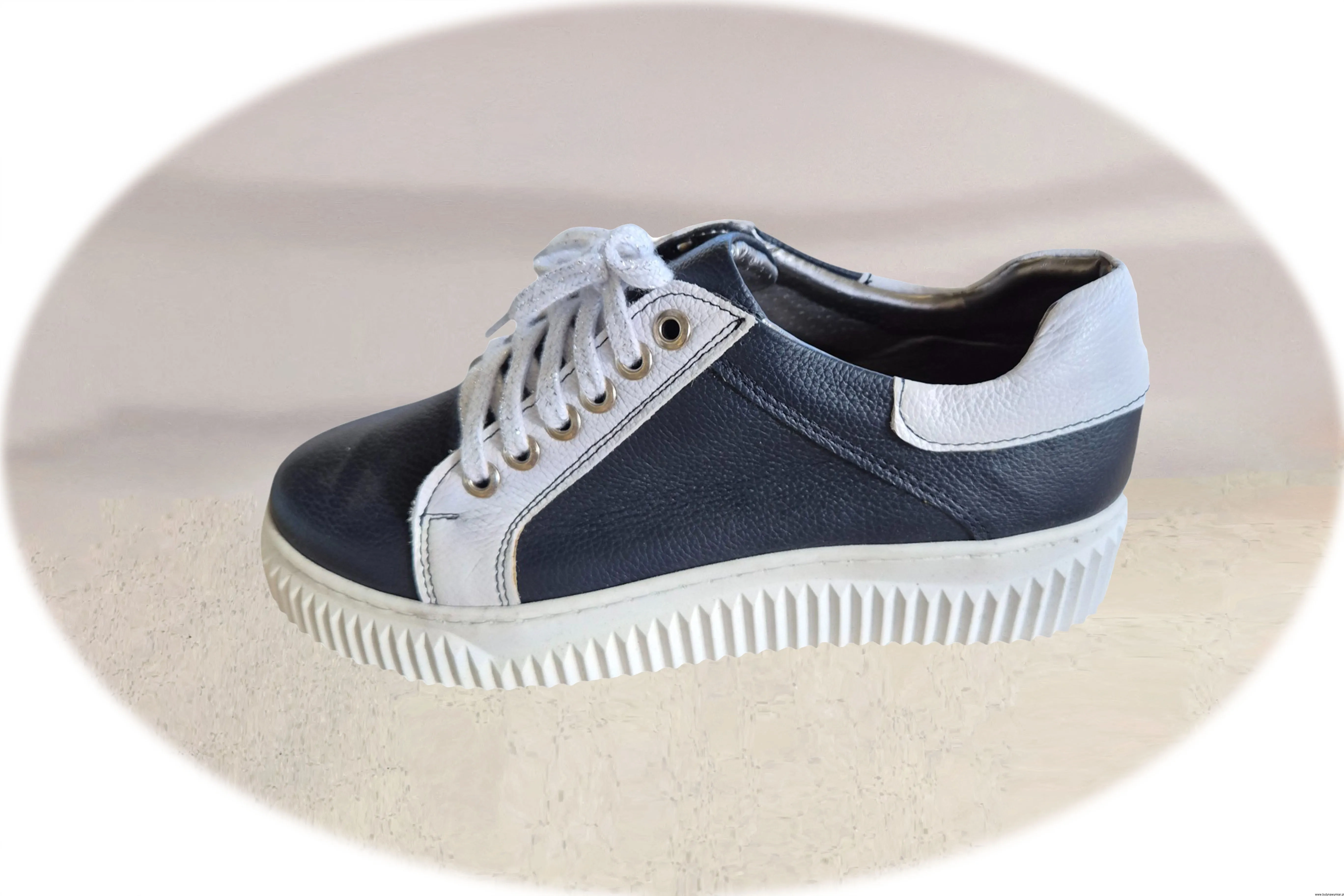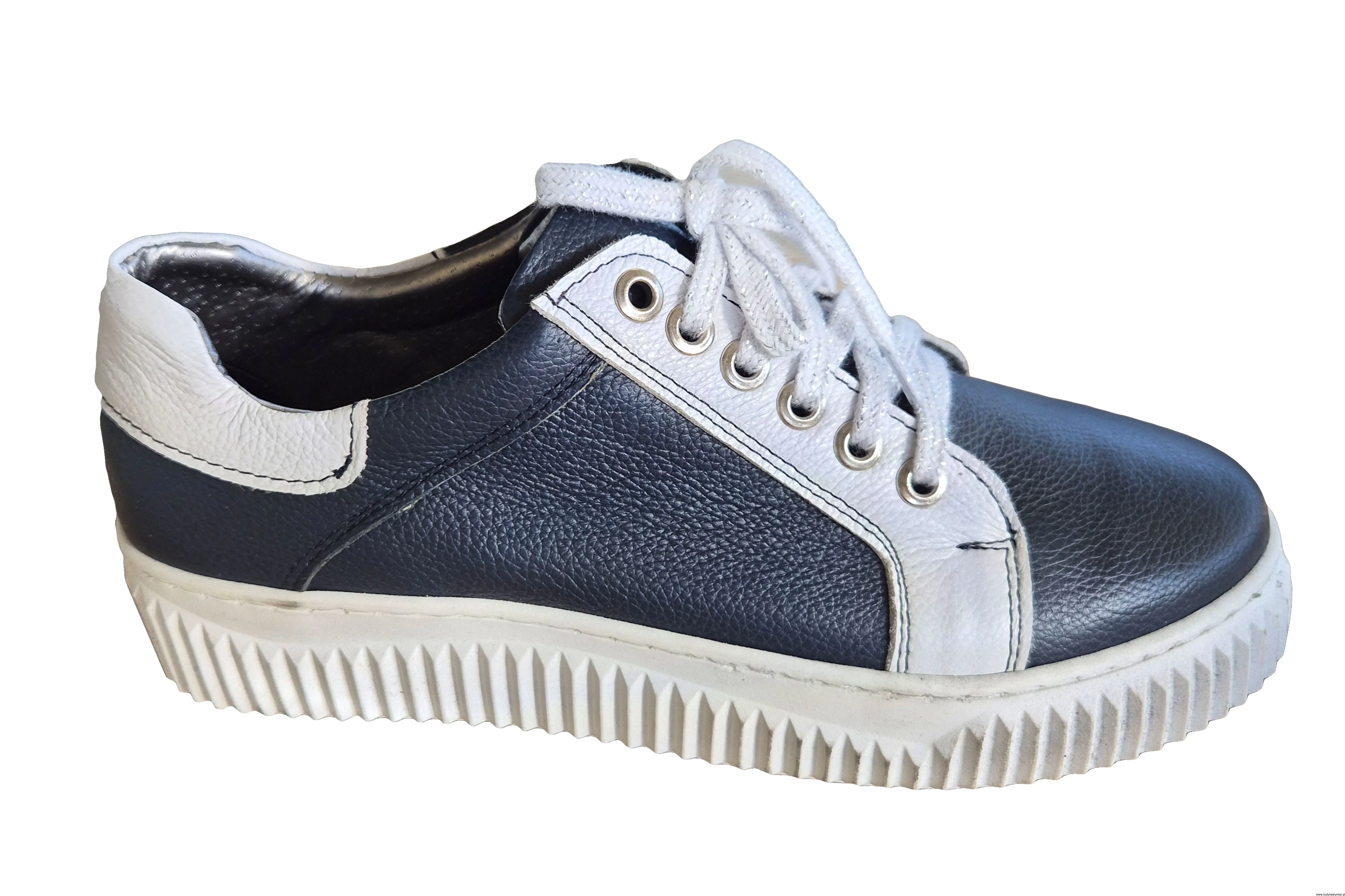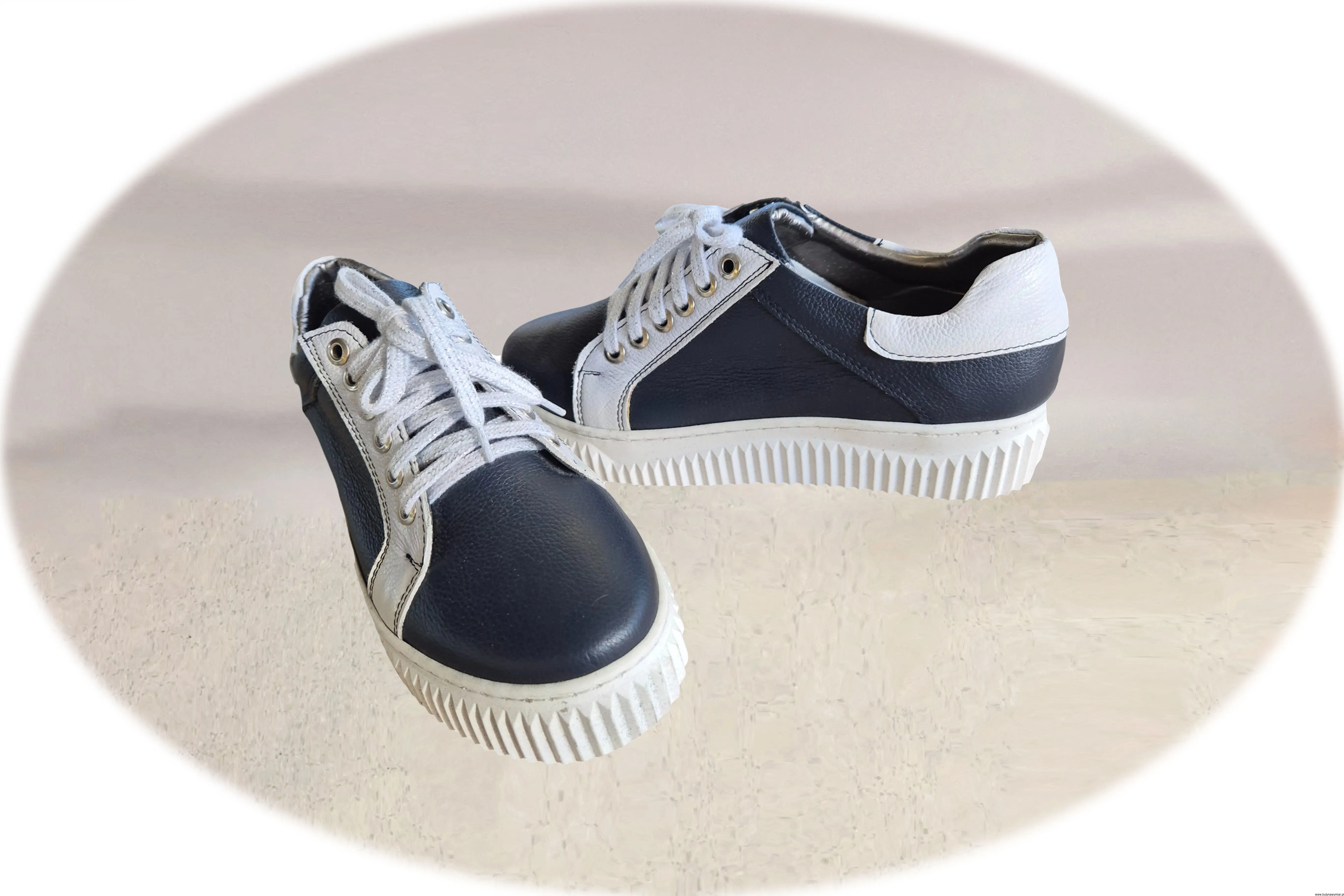 Modne i wygodne damskie buty sportowe w kolorze granatowym, sznurowane wykonane ze skóry naturalnej.