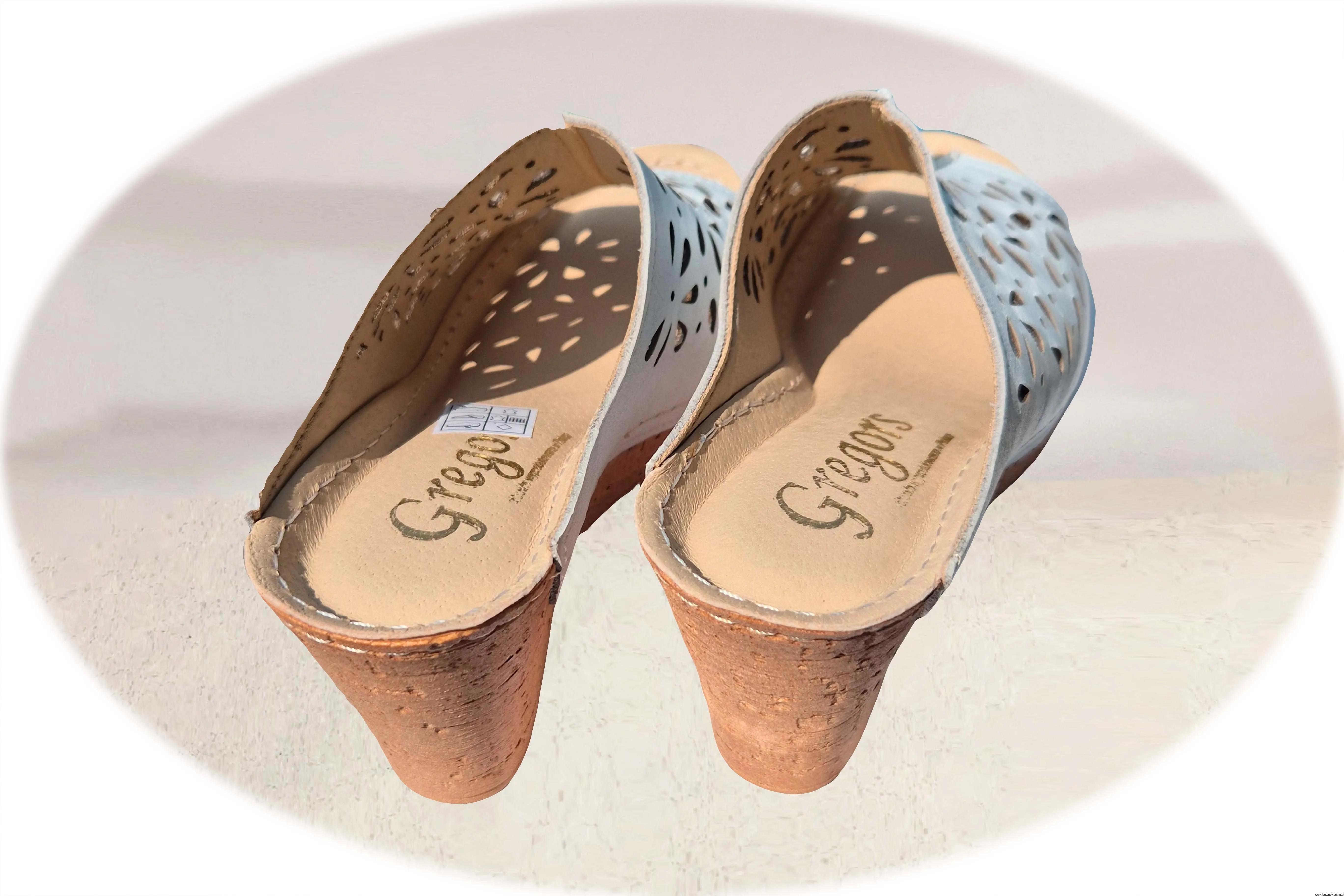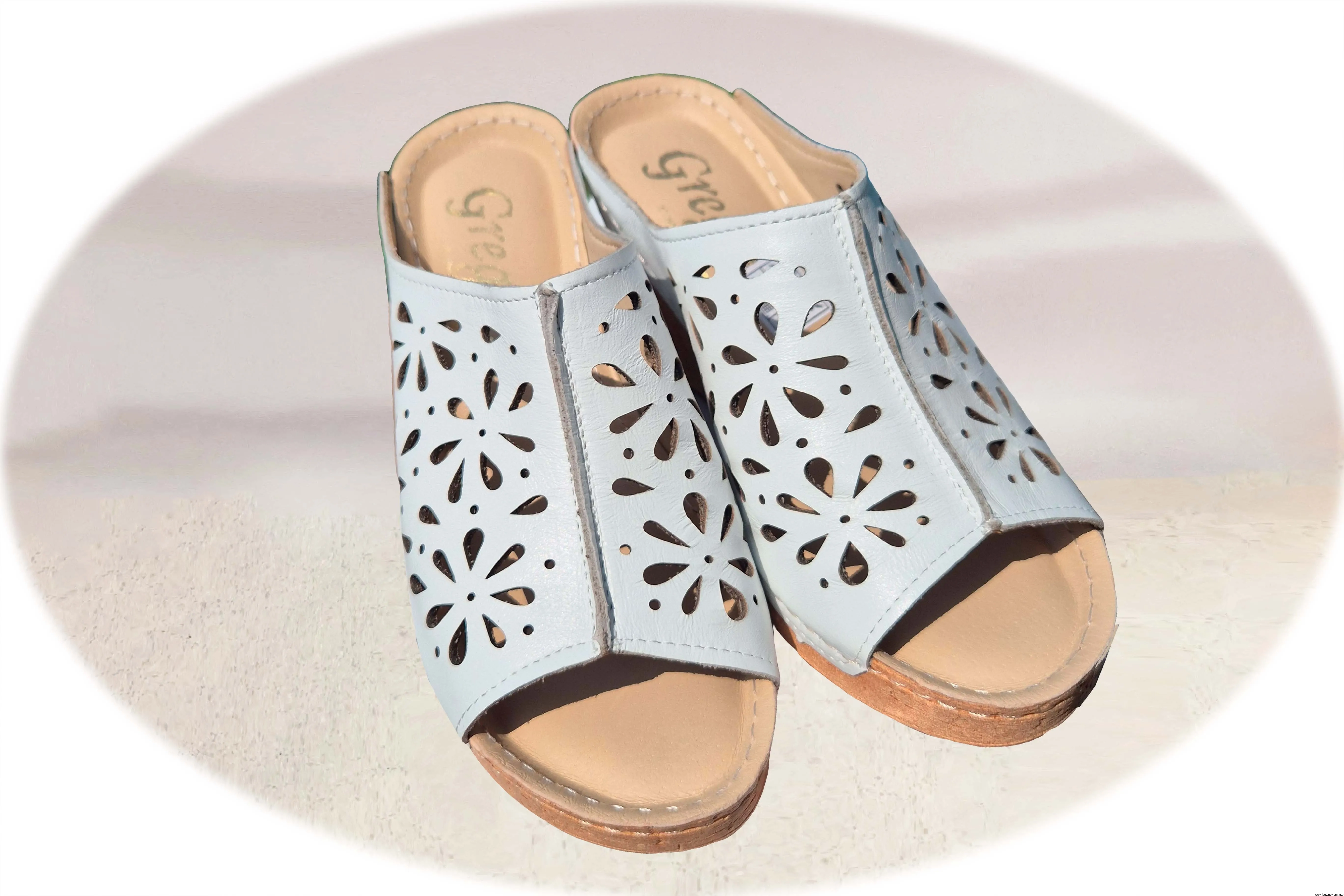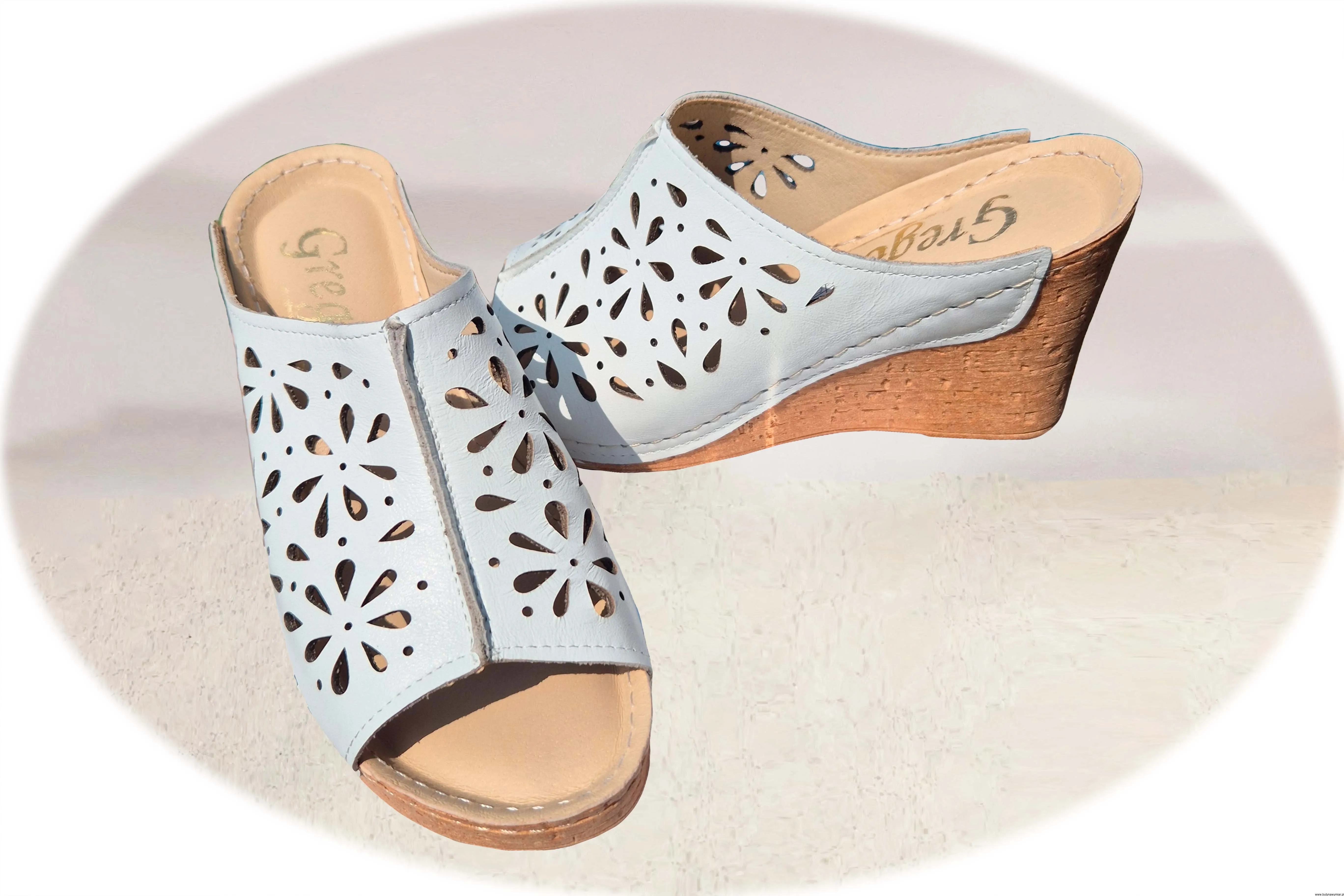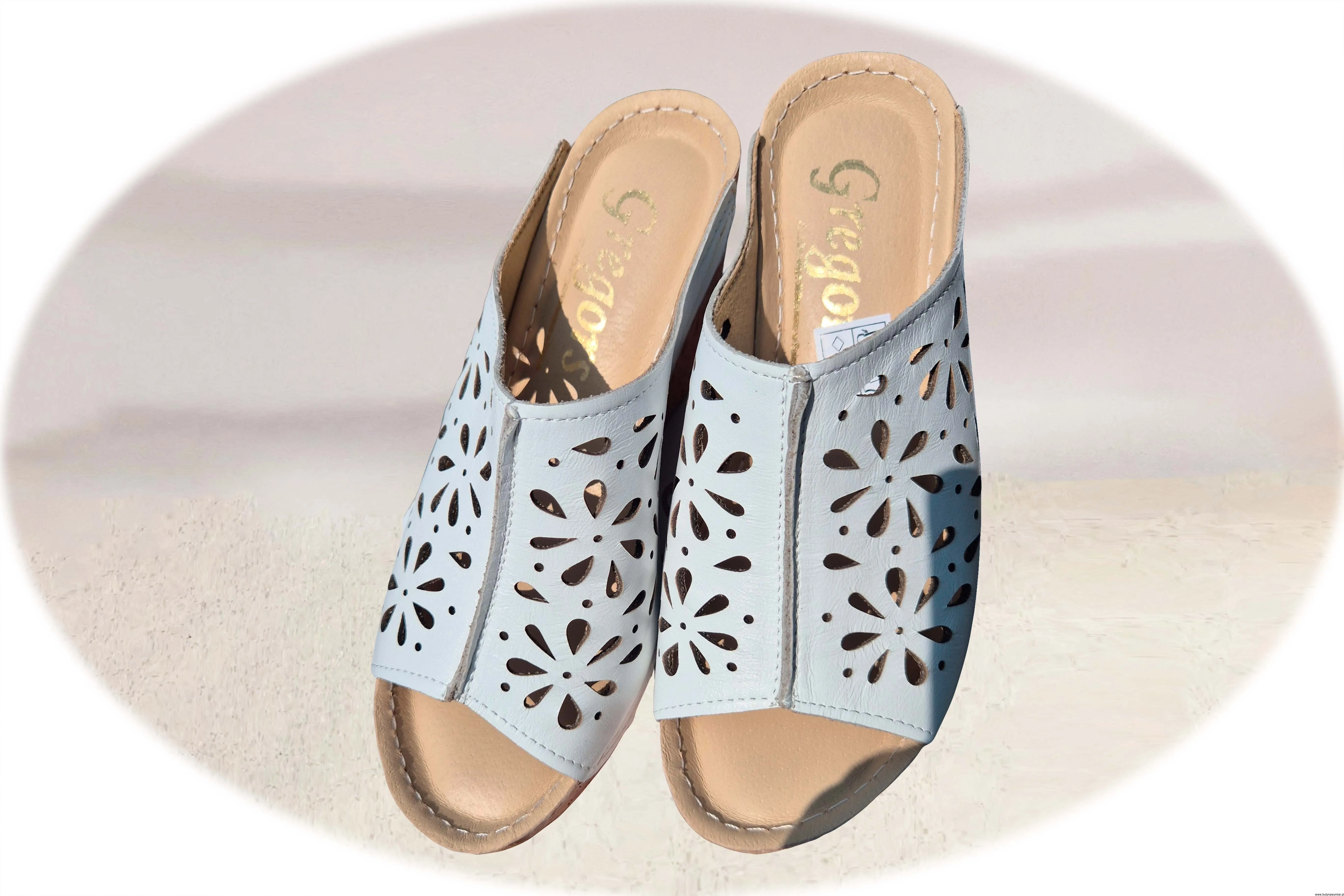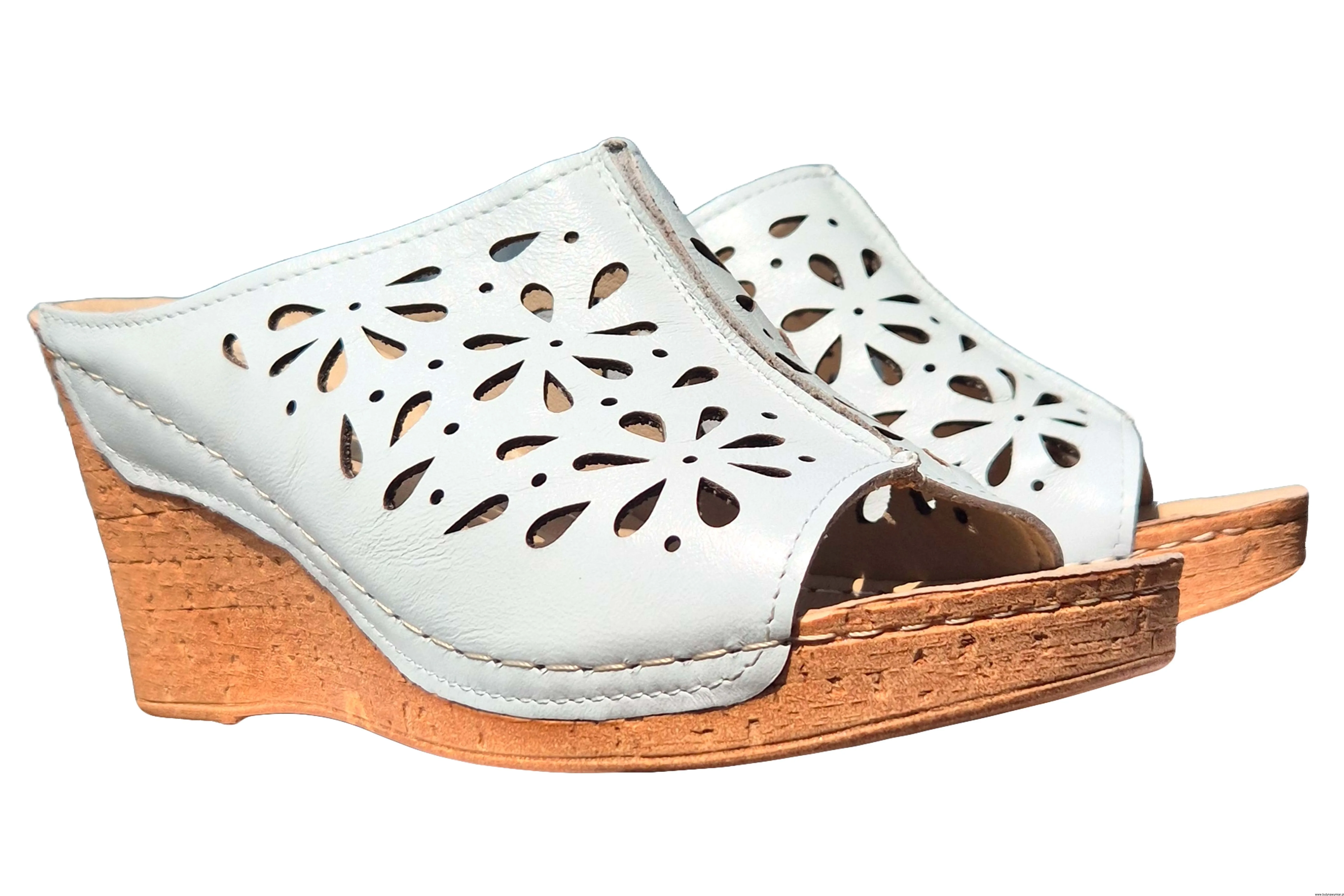 Modne i wygodne wyjątkowe białe klapki damskie wsuwane wykonane ze skóry naturalnej na koturnie